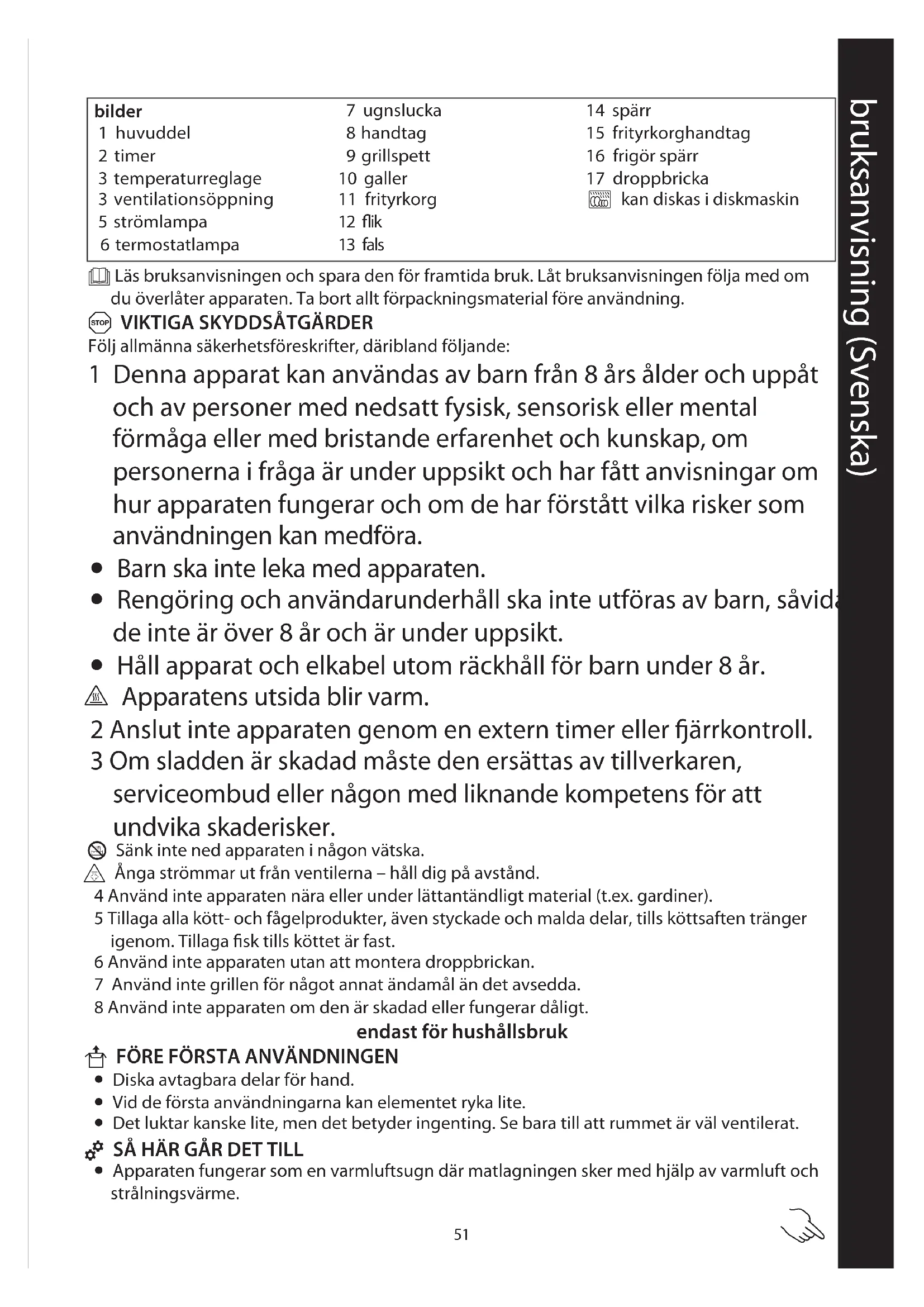 - Apparaten fungerar som en varmluftsugn där matlagningen sker med hjälp av varmluft och strålningsvärme. bruksanvisning (Svenska) bilder 1 huvuddel 2 timer 3 temperaturreglage 3 ventilationsöppning 5 strömlampa 6 termostatlampa 7 ugnslucka 8 handtag 9 grillspett 10 galler 11 frityrkorg 12 flik 13 fals 14 spärr 15 frityrkorghandtag 16 frigör spärr 17 droppbricka ` kan diskas i diskmaskin52