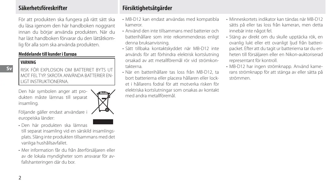 Téléchargez la notice de votre Kameratillbehör au format PDF gratuitement ! Retrouvez votre notice MB-12 - NIKON et reprennez votre appareil électronique en main. Sur cette page sont publiés tous les documents nécessaires à l'utilisation de votre appareil MB-12 de la marque NIKON.