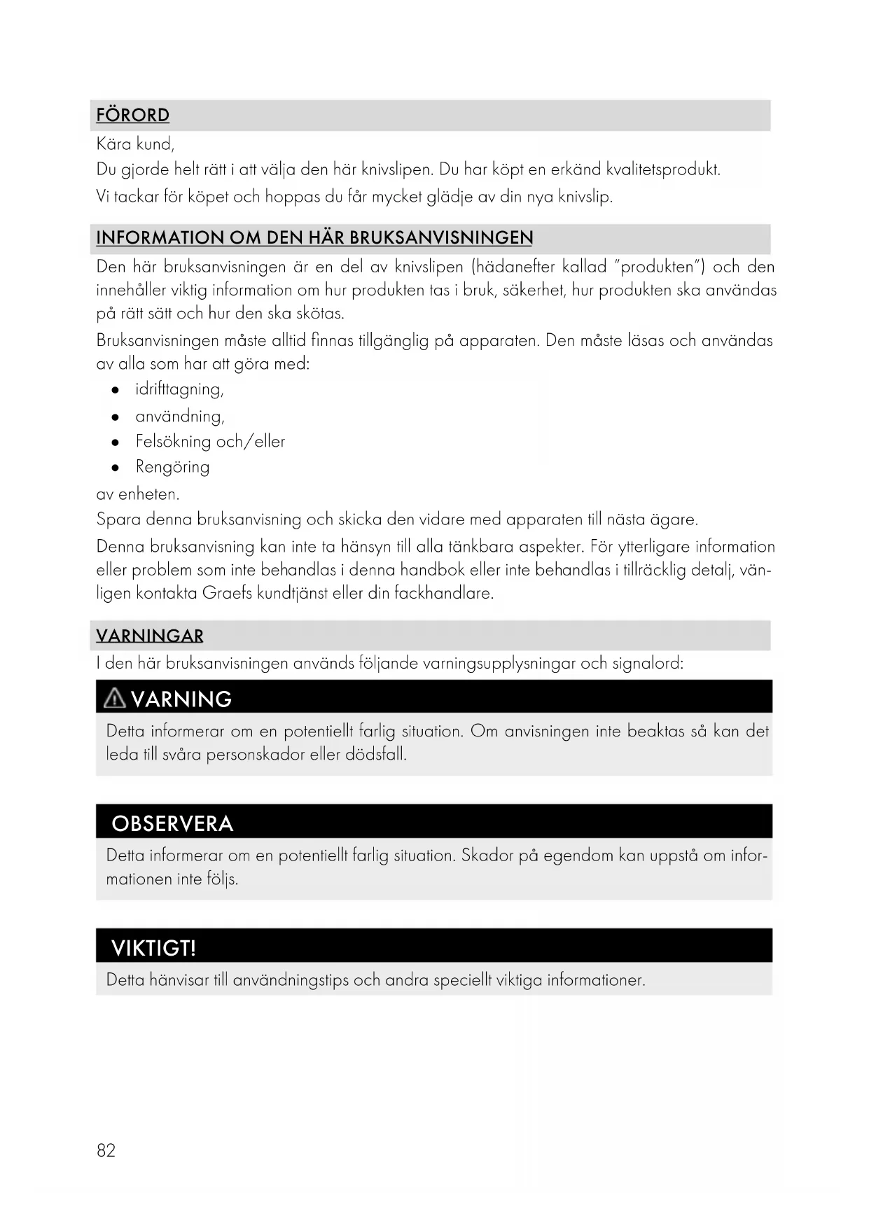 Den här bruksanvisningen är en del av knivslipen (hädanefter kallad ”produkten”) och den innehåller viktig information om hur produkten tas i bruk, säkerhet, hur produkten ska användas på rätt sätt och hur den ska skötas. Bruksanvisningen måste alltid finnas tillgänglig på apparaten. Den måste läsas och användas av alla som har att göra med: ● idrifttagning, ● användning, ● Felsökning och/eller ● Rengöring av enheten. Spara denna bruksanvisning och skicka den vidare med apparaten till nästa ägare. Denna bruksanvisning kan inte ta hänsyn till alla tänkbara aspekter. För ytterligare information eller problem som inte behandlas i denna handbok eller inte behandlas i tillräcklig detalj, vän- ligen kontakta Graefs kundtjänst eller din fackhandlare. VARNINGAR I den här bruksanvisningen används följande varningsupplysningar och signalord: VARNING Detta informerar om en potentiellt farlig situation. Om anvisningen inte beaktas så kan det leda till svåra personskador eller dödsfall. OBSERVERA Detta informerar om en potentiellt farlig situation. Skador på egendom kan uppstå om infor- mationen inte följs. VIKTIGT! Detta hänvisar till användningstips och andra speciellt viktiga informationer.83