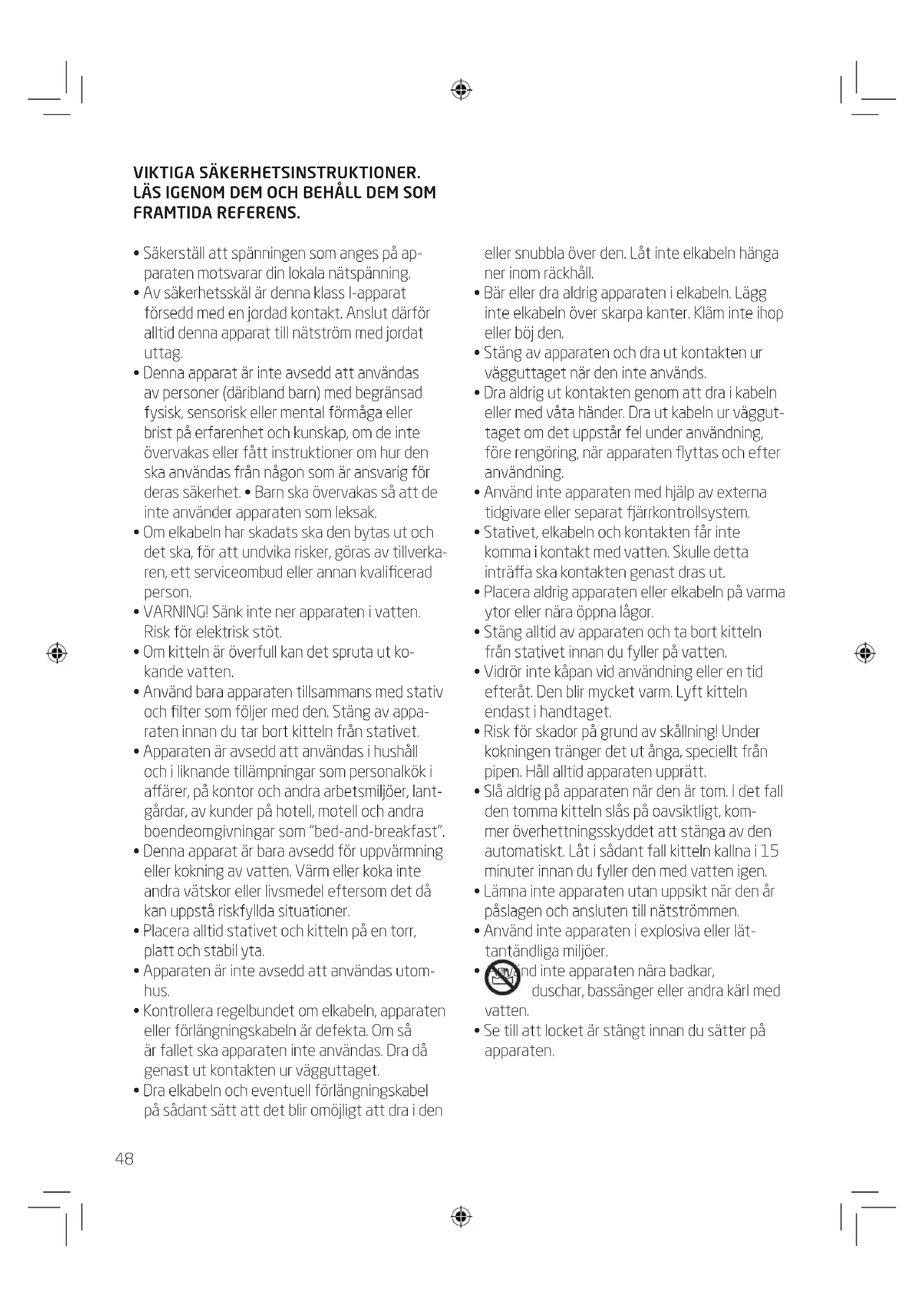 - Denna apparat är bara avsedd för uppvärmning eller kokning av vatten. Värm eller koka inte andra vätskor eller livsmedel eftersom det då kan uppstå riskfyllda situationer.