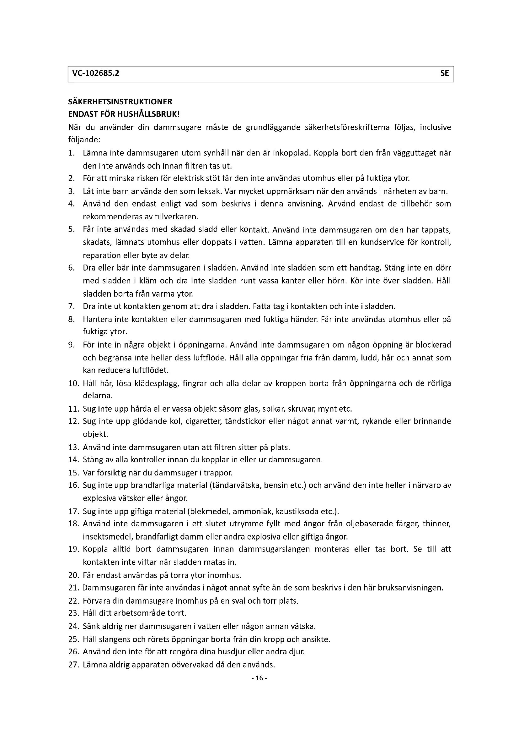 SÄKERHETSINSTRUKTIONER ENDASTFÖRHUSHÅLLSBRUK! När du använder din da mmsugare måste de grundläg gande säkerhetsföreskrifterna följas, inclusive följande: