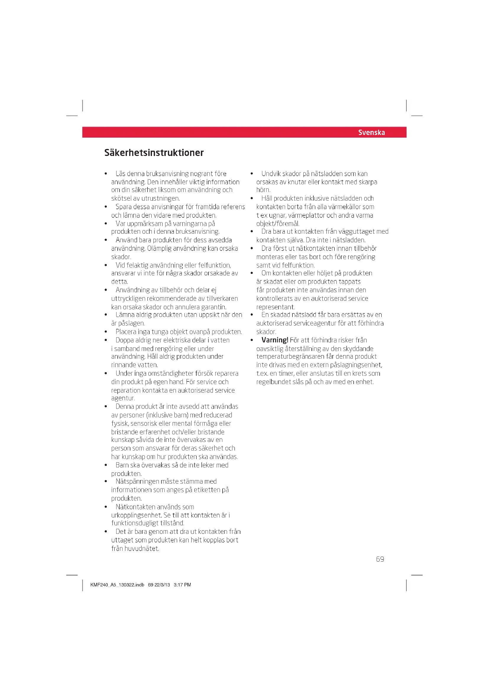Säkerhetsinstruktioner Œ Läs denna bruksanvisning nogrant före användning. Den innehåller viktig information om din säkerhet liksom om användning och skötsel av utrustningen. Œ Spara dessa anvisningar för framtida referens och lämna den vidare med produkten. Œ Var uppmärksam på varningarna på produkten och i denna bruksanvisning. Œ Använd bara produkten för dess avsedda användning. Olämplig användning kan orsaka skador. Œ Vid felaktig användning eller felfunktion, ansvarar vi inte för några skador orsakade av detta. Œ Användning av tillbehör och delar ej uttryckligen rekommenderade av tillverkaren kan orsaka skador och annulera garantin. Œ Lämna aldrig produkten utan uppsikt när den är påslagen. Œ Placera inga tunga objekt ovanpå produkten. Œ Doppa aldrig ner elektriska delar i vatten i samband med rengöring eller under användning. Håll aldrig produkten under rinnande vatten. Œ Under inga omständigheter försök reparera din produkt på egen hand. För service och reparation kontakta en auktoriserad service agentur. Œ Denna produkt är inte avsedd att användas av personer (inklusive barn) med reducerad fysisk, sensorisk eller mental förmåga eller bristande erfarenhet och/eller bristande kunskap såvida de inte övervakas av en person som ansvarar för deras säkerhet och har kunskap om hur produkten ska användas. Œ Barn ska övervakas så de inte leker med produkten. Œ Nätspänningen måste stämma med informationen som anges på etiketten på produkten. Œ Nätkontakten används som urkopplingsenhet. Se till att kontakten är i funktionsdugligt tillstånd. Œ Det är bara genom att dra ut kontakten från uttaget som produkten kan helt kopplas bort från huvudnätet. Œ Undvik skador på nätsladden som kan orsakas av knutar eller kontakt med skarpa hörn. Œ Håll produkten inklusive nätsladden och kontakten borta från alla värmekällor som t ex ugnar, värmeplattor och andra varma objekt/föremål. Œ Dra bara ut kontakten från vägguttaget med kontakten själva. Dra inte i nätsladden. Œ Dra först ut nätkontakten innan tillbehör monteras eller tas bort och före rengöring samt vid felfunktion. Œ Om kontakten eller höljet på produkten är skadat eller om produkten tappats får produkten inte användas innan den kontrollerats av en auktoriserad service representant. Œ En skadad nätsladd får bara ersättas av en auktoriserad serviceagentur för att förhindra skador. Œ Varning! För att förhindra risker från oavsiktlig återställning av den skyddande temperaturbegränsaren får denna produkt inte drivas med en extern påslagningsenhet, t.ex. en timer, eller anslutas till en krets som regelbundet slås på och av med en enhet. KMF240_A5_130322.indb 69 22/3/13 3:17 PMSvenska