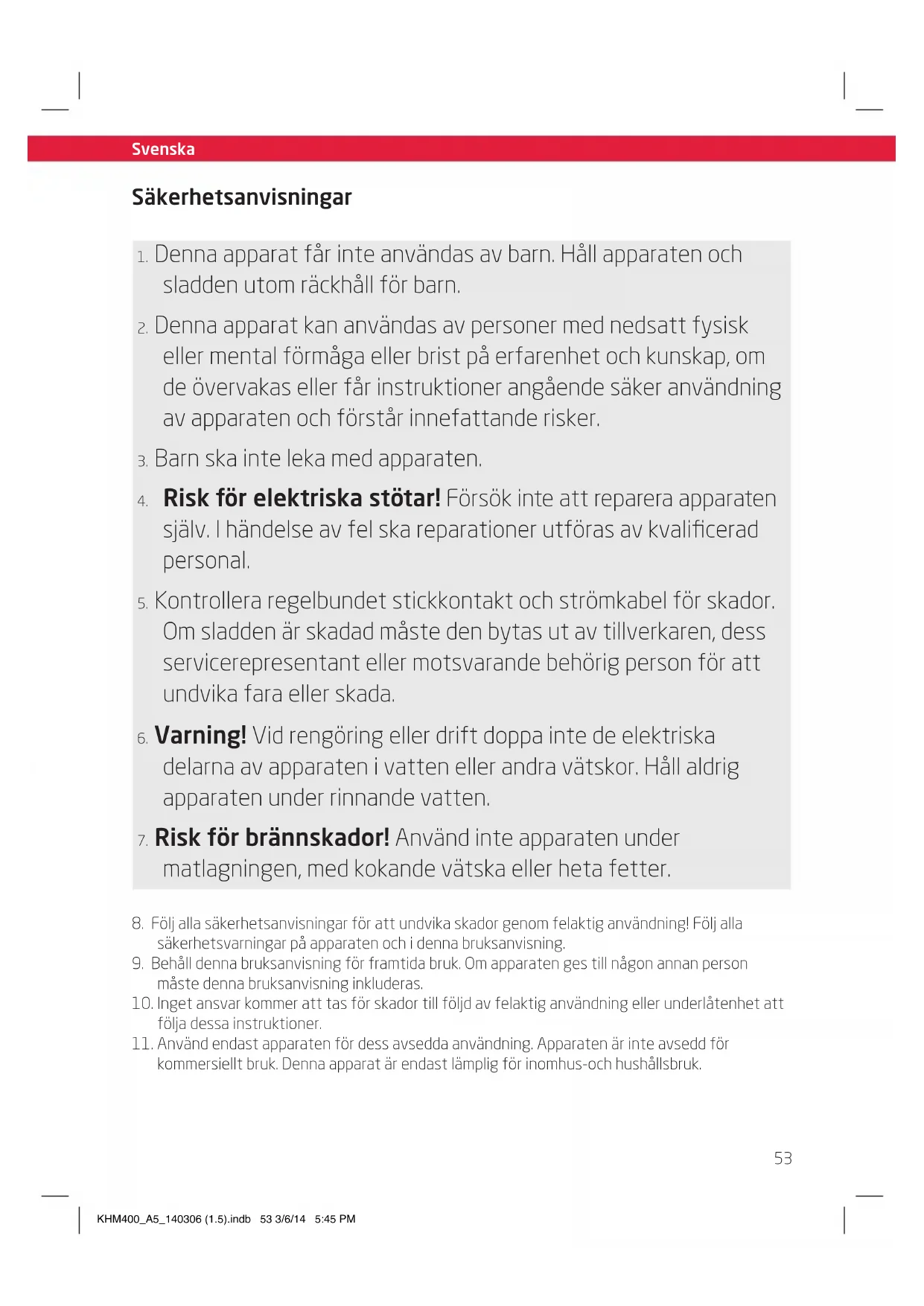 kommersiellt bruk. Denna apparat är endast lämplig för inomhus-och hushållsbruk. KHM400_A5_140306 (1.5).indb 53 3/6/14 5:45 PM54 Svenska Svenska Säkerhetsanvisningar