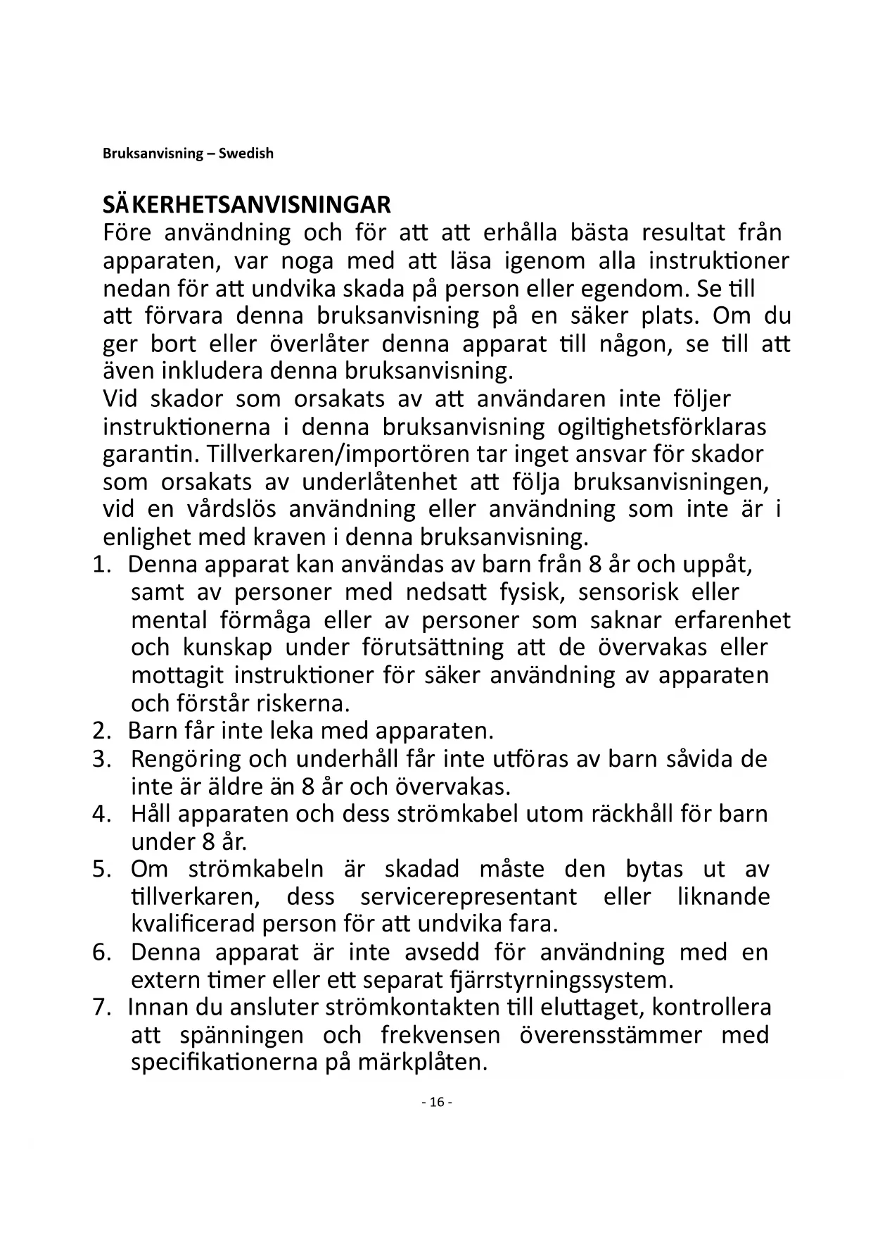 16. Lämna aldrig apparaten obevakad vid användning.