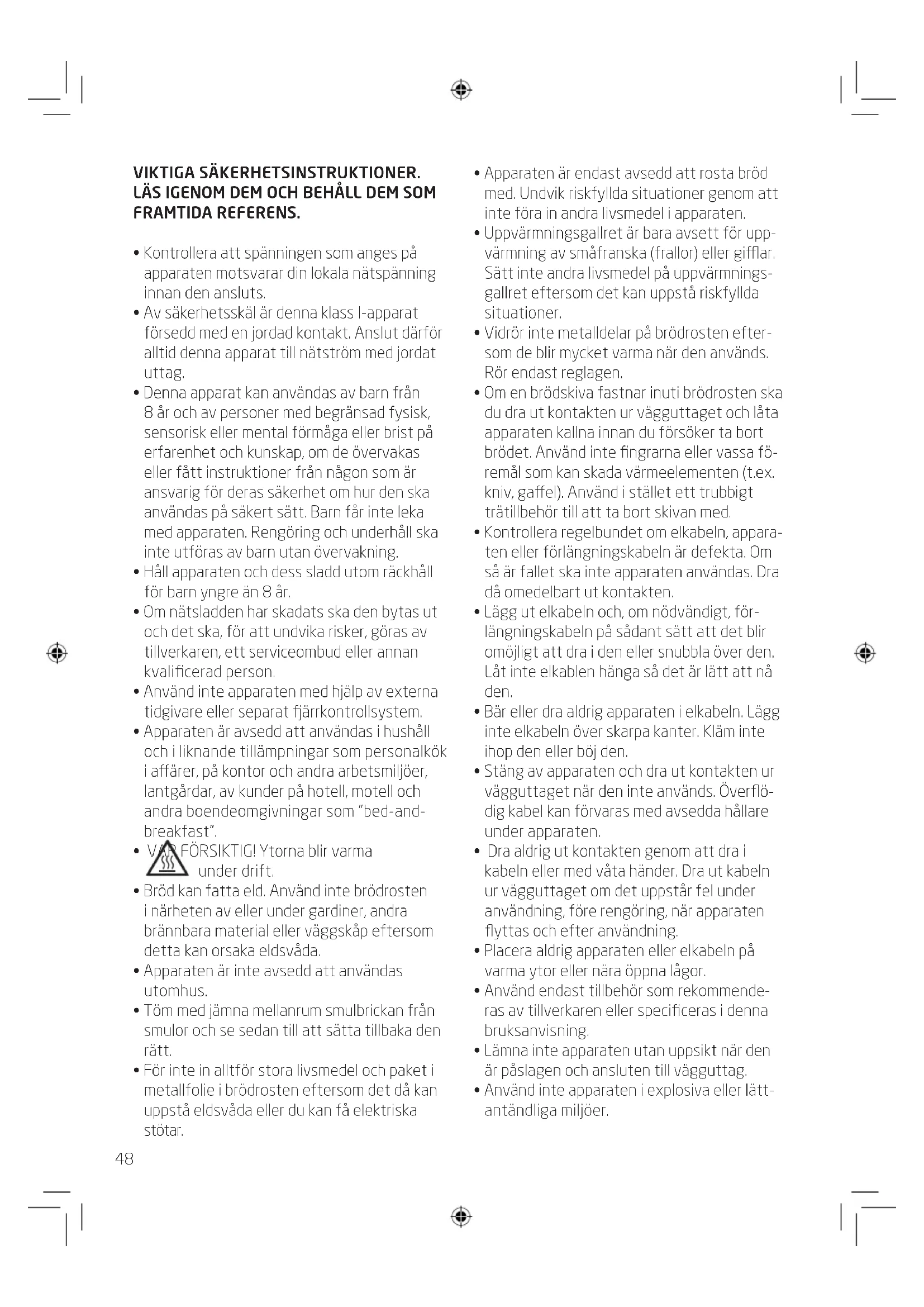 - Apparaten är endast avsedd att rosta bröd med. Undvik riskfyllda situationer genom att inte föra in andra livsmedel i apparaten.
