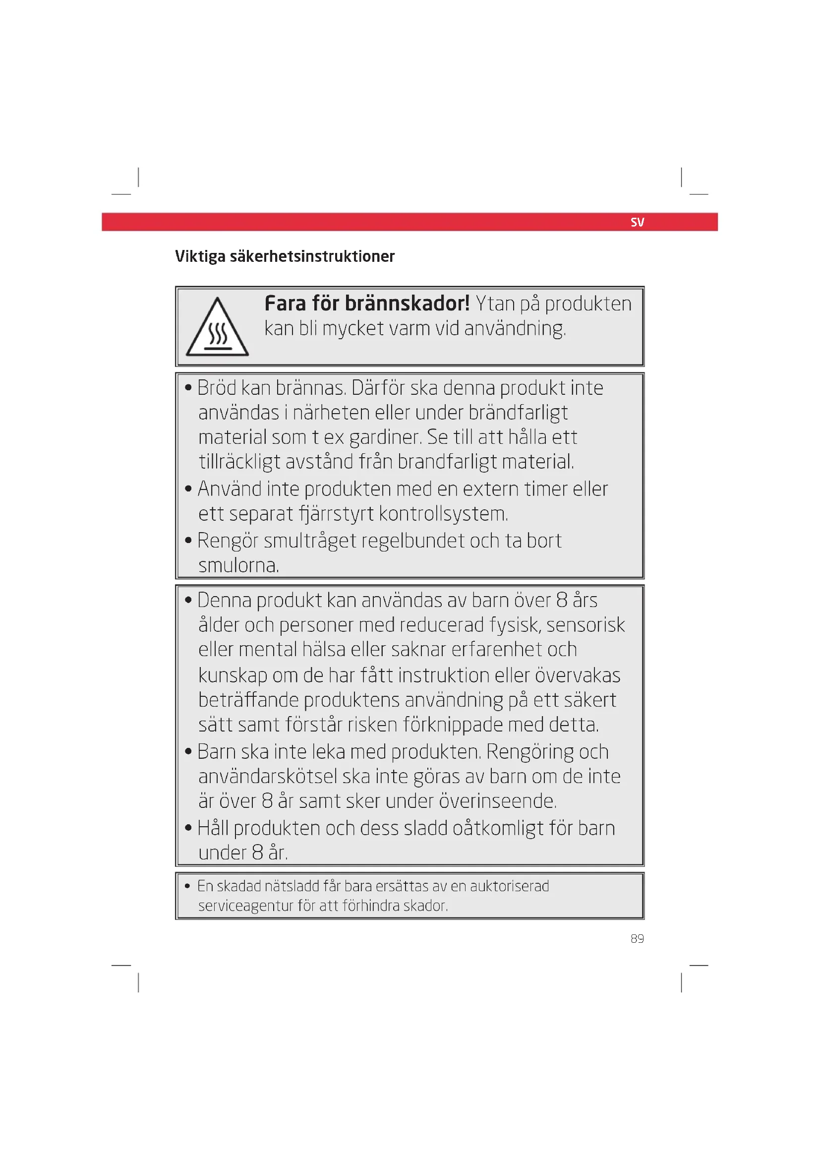 FÖRSIKTIGHET Risk för brännskada när onormalt bröd används för rostning. På grund av mindre storlek eller form finns risk för beröring av varma delar när det rostade brödet tas ut.93