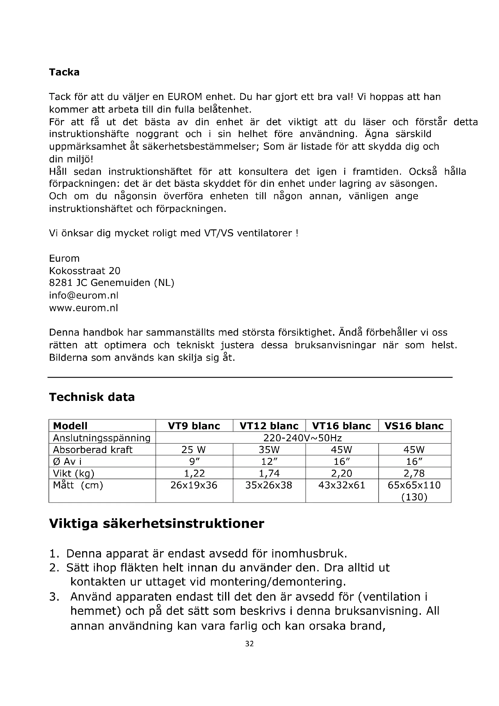 med fästskruven.37 Drift Fläktarna kan snurra med olika hastigheter: VT9 blanc har två lägen medan VT12 blanc, VT16 blanc och VS16 blanc har tre lägen. Alla typerna har en oscilleringsfunktion (45°). När: – fläkten har satts ihop helt och hållet – alla anslutningar har skruvats fast ordentligt – alla säkerhetsföreskrifter har beaktats kan du ta fläkten i drift: Sätt i kontakten i uttaget Välj effekt: 0=av, 1=standard, 2=stark och 3=extra stark. Fläkten sätts nu på. Tryck om så önskas på oscilleringsknappen ovanpå motorn. Då börjar fläkten oscillera med en 45-gradig vinkel. Genom att dra ut samma knapp stänger du av oscilleringsfunktionen (roteringen) igen. För att vinkla fläkten uppåt eller nedåt en aning kan du justera motorblocket upp eller ned i förhållande till foten. Innan du gör det ska du först stänga av fläkten och dra ut kontakten ur uttaget! Tryck på 0-knappen för att stänga av fläkten. Om du vill stänga av fläkten i mer än några minuter bör du dessutom dra ut kontakten ur uttaget. Rengöring och underhåll Stäng av fläkten och dra ut kontakten ur uttaget om du vill rengöra eller underhålla fläkten. Fläkten behöver bara lite allmänt underhåll utvändigt. Damma regelbundet av den med en mjuk duk eller en dammvippa eller rengör den med en mjuk dammsugarborste. Om den är riktigt smutsig öppnar du det främre gallret och torkar av gallren och bladen med en lätt fuktad trasa med ett skonsamt hushållsrengöringsmedel. Torka allt, låt fläkten torka och sätt ihop den igen helt innan du använder den. Se till att inget vatten kan komma på andra delar än gallren och bladen! Spola aldrig av fläkten! Använd inga sprayer. Använd aldrig aggressiva eller frätande (rengörings)medel för att förhindra att materialet missfärgas eller missformas. Om du vill röja undan fläkten vid säsongens slut gör du det i originalförpackningen: den ger bästa skydd. Ställ undan den på en säker, torr och inte alltför varm eller kall plats. Problem och åtgärder Fläktbladet snurrar inte när fläkten är påslagen Sitter kontakten i uttaget ordentligt? Är det ström i uttaget? Är knapp 1, 2 eller 3 intryckt?38 Blockeras bladet på något sätt, t.ex. på grund av en skada, för att skyddsgallret har missformats eller på grund av ett främmande föremål? Ett konstigt ljud hörs när fläkten startas Kontrollera att fläktbladen är placerade så långt över motoraxeln som möjligt. Kontrollera om det är grader på bladens kanter. Kontrollera om fläktbladet vidrör en missformad del av skyddsgallret. Varning: Reparationer ska utföras av utbildade reparatörer. Detsamma gäller vid byte eller reparation av elkabeln och kontakten. Be alltid om originaldelar vid reparation. Ändringar på apparaten och icke professionellt utförda reparationer medför att garantin och återförsäljarens, importörens och tillverkarens ansvar upphör att gälla. Avfallshantering Inom EU innebär denna symbol att produkten inte få kastas som vanliga hushållssopor. Gammal utrustning innehåller värdefulla material, lämpligt för recycling. Dessa material bör göras tillgänglig för återvinning för att förhindra negativ påverkan på hälsa och miljö p.g.a. okontrollerad sophämtning. Vänligen lämna därför gammal utrustning till därför avsedda insamlingsställen. Alternativt, kontakta den ursprungliga leverantören som kan se till att så många komponenter som möjligt kan återvinnas. CE - deklaration Se sidan 46.39 Kiitos Kiitos, että valitsit EUROM-laitteen. Olet tehnyt hyvän valinnan! Toivomme, että se toimii täysin tyytyväisenä. Parhaan hyödyn saamiseksi laitteesta on tärkeää, että luet tämän käyttöohjeen huolellisesti ja kokonaisuudessaan ja ymmärrät myös sen ennen käyttöä. Kiinnitä erityistä huomiota turvallisuusmääräyksiin; jotka on lueteltu suojaamaan sinua ja ympäristöäsi! Tallenna sitten käyttöohjeet tulevaa käyttöä varten. Pidä myös pakkaus: se on paras suoja laitteellesi vuodenaikojen ulkopuolella tapahtuvan varastoinnin aikana. Ja jos siirrät laitteen jollekin toiselle, sisällytä käyttöohjeet ja pakkaukset. Toivotamme sinulle paljon iloa VS / VT tuuletin! Eurom Kokosstraat 20 8281 JC Genemuiden (NL) info@eurom.nl www.eurom.nl Tämä opas on koottu erittäin huolellisesti. Me varaamme kuitenkin oikeuden optimoida tämä käyttöohje milloin tahansa ja mukauttaa sitä teknisesti. Käytetyt kuvat voivat vaihdella.