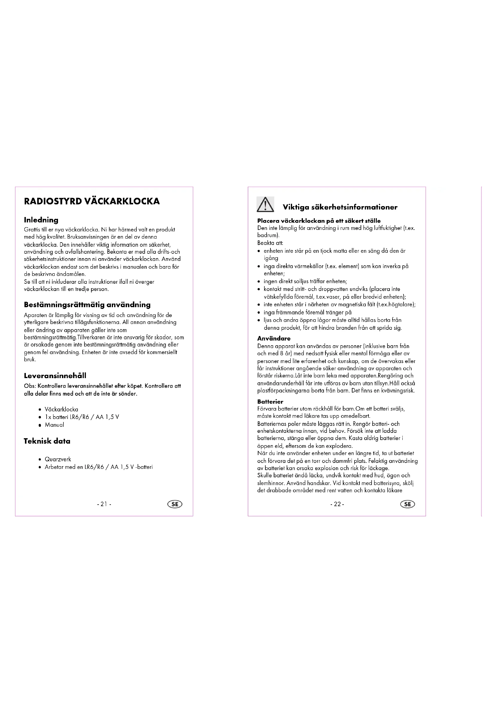 Inledning Grattis till er nya väckarklocka. Ni har härmed valt en produkt med hög kvalitet. Bruksanvisningen är en del av denna väckarklocka. Den innehåller viktig information om säkerhet, användning och avfallshantering. Bekanta er med alla drifts-och säkerhetsinstruktioner innan ni använder väckarklockan. Använd väckarklockan endast som det beskrivs i manualen och bara för de beskrivna ändamålen. Se till att ni inkluderar alla instruktioner ifall ni överger väckarklockan till en tredje person. Bestämningsrättmätig användning Aparaten är lämplig för visning av tid och användning för de ytterligare beskrivna tillägsfunktionerna. All annan användning eller ändring av apparaten gäller inte som bestämningsrättmätig.Tillverkaren är inte ansvarig för skador, som är orsakade genom inte bestämningsrättmätig användning eller genom fel användning. Enheten är inte avsedd för kommersiellt bruk. Leveransinnehåll Obs: Kontrollera leveransinnehållet efter köpet. Kontrollera att alla delar finns med och att de inte är sönder.