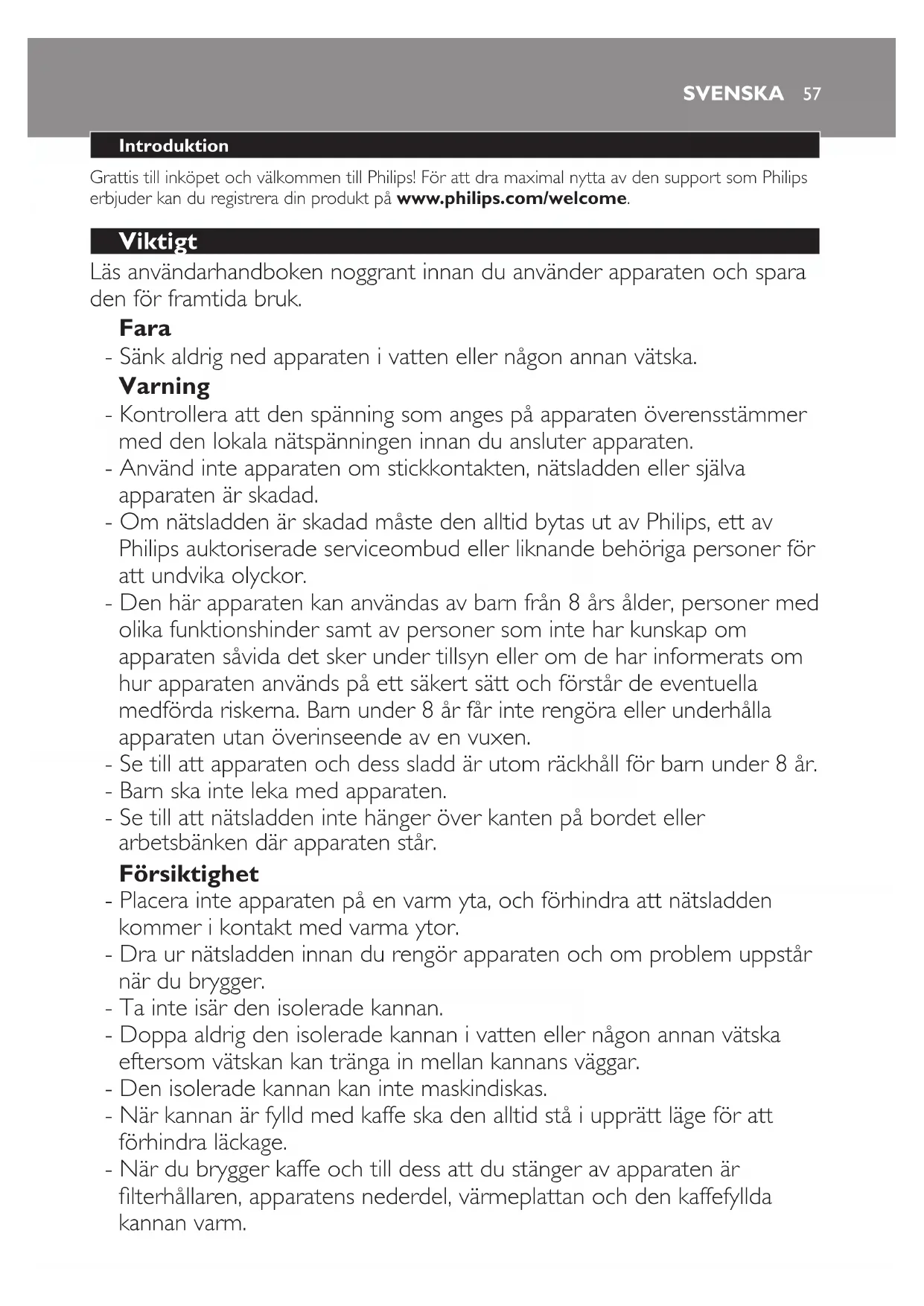 Av/på-knappenlyserkontinuerligitosekunderforåbekrefteatferskhetsindikatorenerslåttav. Du kan slå på ferskhetsindikatoren ved å følge trinnene nedenfor. 1 Koblefraapparatet. 2 Trykkpåogholdnedeav/på-bryterenogsettstøpselettilbakeistikkontakten. , Av/på-knappenblinkerrasktforåbekrefteatferskhetsindikatorenerslåttpå. Skylle apparatet før første gangs bruk 1 Fjernvannbeholderenfraapparatet(1),ogfjernlokketpåvannbeholderen(2)(g.2). 2 Fyllvannbeholderenmedfriskt,kaldtvannfraspringen(g.3). 3 Settlokketpåvannbeholderen(1),ogsettvannbeholderentilbakepåapparatet(2)(g.4). Ikke legg i lter eller kaffe i lterholderen. 4 Trykknedav/på-knappenforåslåpåapparatet(g.5). 5 Laapparatetarbeidetilvannbeholderenertom. 6 Trykknedav/på-knappenforåslåavapparatet(g.6). Merk: HD7699/HD7697 slås av automatisk. 7 Rengjørglasskannenoglterholderen(seavsnittetRengjøring).(g.7) 8 Laapparatetavkjølesiminsttreminutterførdubegynneråtraktekaffe. Ikkerengjørdenisolertekannenioppvaskmaskin. Isolert kanne (kun HD7697) Merk: Vi anbefaler at du forvarmer den isolerte kannen med varmt vann fra springen før du begynner å trakte kaffe, for å sikre at kaffen er varmere. 1 Dufjernerlokketfradenisolertekannenvedåvridetmedklokkenhelttilpilenpåkannen pekermotfjernlokk-symboletpålokket(g.8). 2 Skylldenisolertekannenmedvarmtvannfraspringenforåforhåndsvarmeden(g.9). Trakt minst en halv kanne med kaffe for å få kaffe som er ordentlig varm, og som har den beste smaken. 3 Nårduvilhellekaffe,vrirdulokketmotklokkentilpilenpåkannenpekermothellesymbolet pålokket.Lukkalltidlokketnårduharheltkaffe,slikatkaffenholdersegvarm(g.10). 4 Dulukkerlokketvedåvridettilvenstrehelttilpilenpåkannenpekermotlukket/trakter- symboletpålokket(g.11). Bruke apparatet Trakte kaffe Dette apparatet er utstyrt med en AromaSelect-bryter som lar deg justere styrken på kaffen i henhold til din egen smak. Du kan eksperimentere med AromaSelect for å nne styrken du liker best. 1 Kontrolleratstøpseletstårienjordetstikkontakt. 2 Kontrolleratglasskannenellerdenisolertekannen(medlokketiposisjonenlukket/trakter) erplassertunderlterholderen. NORSK523 Angikaffestyrkenduforetrekker,medAromaSelect-bryteren.(g.12) Du kan velge kaffestyrken ved å vri bryteren til ønsket posisjon: mild, vanlig eller intens. 4 Taavvannbeholderenogfylldenmedrent,kaldtvannfraspringen(g.13). Nivåindikasjonene tilsvarer små kopper på 80 ml og store kopper på 120 ml. 5 Settlokketpåvannbeholderen(1),ogsettvannbeholderenordentligtilbakepåapparatet (2)(g.2). 6 Taetpapirlter(type1x4ellernr.4),ogbrettkantenepådetforåforhindrefolderog rifter(g.14). 7 Åpnelterholderlokket(1)ogplasseretpapirlterilterholderen(2)(g.15). 8 Leggdenforhåndsmaltekaffen(ltermalt)ilteret(1)oglukklterholderlokket(2)(g.16). Tips: Prøv deg frem med mengde kaffe og vann for å nne den perfekte fordelingen av kaffe og vann som passer din smak. 9 Trykknedav/på-knappenforåslåpåapparatet(g.6). 10 Nåraltvannetharrentgjennomlteret,kandutakannenavvarmeplaten. Hvisdufjernerkannenimerenn20sekunderføraltvannethargåttgjennomlteret,kanlteret renneover. , HD7697:Apparatetslårsegavautomatiskettertraktingen.Denisolertekannenholder kaffenvarm. , HD7695/HD7685:Kaffenholdesvarmpåvarmeplatentilduslåravapparatetellertil apparatetslåsavautomatiskihenholdtildenangittevarmetiden. 11 Åpnelterholderlokket(1),ogfjernlterholderen(2)(g.17). 12 Kastpapirlteret.(g.18) 13 Laapparatetavkjølesiminsttreminutterførdutrakterkaffeigjen. Merk: Hvis du har valgt en varmetid på 60 minutter eller mer, begynner lyset i av/på-bryteren å blinke etter 30 minutter for å indikere at ferskheten i kaffen avtar. Rengjøring Apparatetmåaldrisenkesnedivann. 1 Koblefraapparatet. 2 Rengjørutsidenavapparatetmedenfuktigklut(g.19). 3 Åpnelterholderlokket(1),ogtaavlterholderen(2)(g.17) Merk: Pass på at du plasserer lterholderen ordentlig tilbake i apparatet. 4 Rengjørglasskannen(kunHD7695/HD7685)oglterholderenivarmtvannmedlitt oppvaskmiddelellerioppvaskmaskinen(g.20). Se delen Isolert kanne (kun HD7699/HD7697) i dette avsnittet når du skal rengjøre den isolerte kannen. Ikkesenkdenisolertekannennedivannellerannenvæske,ogikkerengjørdenioppvaskmaskin da dette kan skade kannen. 5 Nårduharrengjortglasskannen,skyllerdudenirent,varmtvann(g.21). Vannbeholder 1 Fjernvannbeholderenfraapparatet(1),ogfjernlokketpåvannbeholderen(2)(g.2). NORSK 532 Rengjørvannbeholderenivarmtvann,omnødvendigmedlittytendeoppvaskmiddel, ellerioppvaskmaskinen(g.22). Merk: Hvis du bruker oppvaskbørste, må du være forsiktig, slik at du ikke skader ventilen i bunnen av vannbeholderen. Ikkebrukgjenstandermedskarpekantertilårengjørevanninntaketpåapparatet. 3 Skyllvannbeholderenmedrentvannnårduharrengjortden,ogsettdentilbakepå apparatet(g.3). Isolert kanne (kun HD7699/HD7697) Ikkesenkdenisolertekannennedivannellerannenvæske,ogikkerengjørdenioppvaskmaskin da dette kan skade kannen. 1 Taavlokketpådenisolertekannen(g.8). Vri lokket med klokken til pilen på kannen peker mot fjern lokk-symbolet. 2 Rengjørdenisolertekanneninnvendigmedenmykbørste,varmtvannoglitt oppvaskmiddel(g.23). Tips: Gjenstridige brune avleiringer kan fjernes ved å fylle kannen med varmt vann tilsatt en skje med natriumkarbonat. La løsningen virke en stund. 3 Nårduharrengjortdenisolertekannen,skyllerdudenirent,varmtvann(g.24). 4 Settlokkettilbakepådenisolertekannen. Avkalking Regelmessig avkalking forlenger apparatets levetid og garanterer best mulig trakteresultat i lang tid. Ved vanlig bruk (to fulle kanner kaffe per dag) bør apparatet avkalkes: - 2 eller 3 ganger i året hvis du bruker mykt vann (opptil 18 dH) - 4 eller 5 ganger i året hvis du bruker hardt vann (over 18 dH). Du kan bruke hvit eddik med 4 % syre. Du kan også bruke et egnet avkalkingsmiddel. I så fall følger du instruksjonene på pakken. Ikkebrukavkalkingspulver. 1 SettAromaSelect-bryterentilCALC-posisjonen(g.25). Merk: Det anbefales bruk av CALC-posisjonen for å oppnå de beste avkalkingsresu