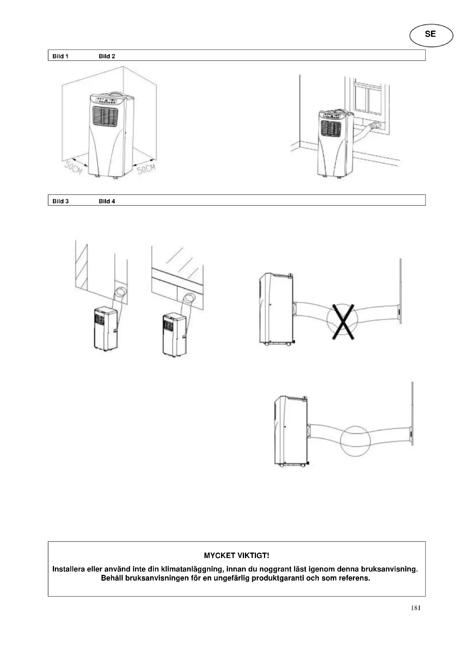 MYCKET VIKTIGT! Installera eller använd inte din klimatanläggning, innan du noggrant läst igenom denna bruksanvisning. Behåll bruksanvisningen för en ungefärlig produktgaranti och som referens. SE182 Observera! Denna apparat kan användas av barn från 8 år och uppåt och personer med nedsatt fysisk och mental förmåga eller brist på erfarenhet och kunskap, om de inte övervakas eller får instruktioner angående användning av apparaten på ett säkert sätt och förstår riskerna inblandade. Rengöring och användarunderhåll ska inte göras av barn utan tillsyn. Enheten är endast avsedd för användning inomhus. Använd inte apparaten om det finns brister eller defekter i nätkabeln, kontakten eller apparaten själv. Enheten får inte anslutas till ett defekt vägguttag. Kontrollera att enheten är korrekt installerad innan den tas i drift. Använd inte enheten i närheten av öppna eldhärdar. Exponera inte enheten för direkt solljus. Stäng av apparaten innan du drar ut nätkontakten. Dra ut nätkontakten innan du rengör eller ställer undan apparaten. Dra också ut nätkontakten om apparaten inte ska användas en längre tid. Rengör apparaten enbart på det sätt som beskrivs i anvisningarna. Apparaten ska anslutas till ett felfritt och jordat vägguttag (220-240VAC, 50 Hz). Apparaten får inte användas utan tillsyn. Stäng av apparaten även om du bara lämnar rummet för en kort stund. Dra alltid i kontaktenheten och inte i kabeln när du vill bryta strömförsörjningen till apparaten. Använd inte enheten i en miljö där det kan spruta olja eller183 vatten. Använd inte enheten i närheten av bad, dusch, simbassäng eller i en tvättstuga/tvättomat. För aldrig in fingrar, pennor eller andra föremål men vakten när nätkontakten är ansluten, speciellt när du kör. Klimatanläggningen måste alltid förvaras och Transporteras upprätt. Vid osäkerhet rekommenderar vi att vänta minst 24 timmar tills klimatanläggningen kopplas in. Säkerställ, att ventilationens in- och utlopp inte blockeras. Använd alltid enheten på en horisontell yta, för att undvika att vatten rinner ut. Använd enbart de reserv- och tillbehörsdelar som tillverkaren rekommenderar, för att undvika skador på apparaten. Reparera aldrig enheten själv Om en reparation är nödvändig, kontakta din återförsäljare. Använd den medföljande POWER på kontrollpanelen. Se till att nätkabeln är korrekt jordad. Om nätkabeln är defekt måste den för att undvika fara bytas ut av återförsäljaren eller dennes kundtjänst alternativt av en lika kvalificerad fackman.184 Beteckning på reservdelar och komponenter