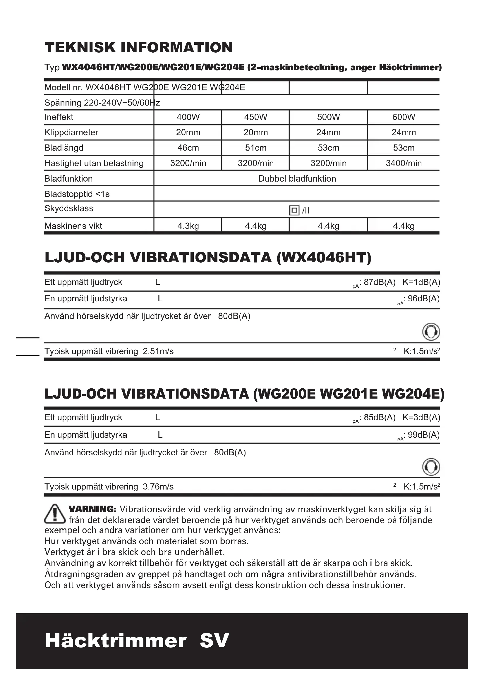 VARNING: Vibrationsvärde vid verklig användning av maskinverktyget kan skilja sig åt från det deklarerade värdet beroende på hur verktyget används och beroende på följande exempel och andra variationer om hur verktyget används: Hur verktyget används och materialet som borras. Verktyget är i bra skick och bra underhållet. Användning av korrekt tillbehör för verktyget och säkerställ att de är skarpa och i bra skick. Åtdragningsgraden av greppet på handtaget och om några antivibrationstillbehör används. Och att verktyget används såsom avsett enligt dess konstruktion och dessa instruktioner. Modell nr. WX4046HT WG200E WG201E WG204E Spänning 220-240V~50/60Hz Ineffekt 400W 450W 500W 600W Klippdiameter 20mm 20mm 24mm 24mm Bladlängd 46cm 51cm 53cm 53cm Hastighet utan belastning 3200/min 3200/min 3200/min 3400/min Bladfunktion Dubbel bladfunktion Bladstopptid <1s Skyddsklass /II Maskinens vikt 4.3kg 4.4kg 4.4kg 4.4kg105104 Häcktrimmer SV