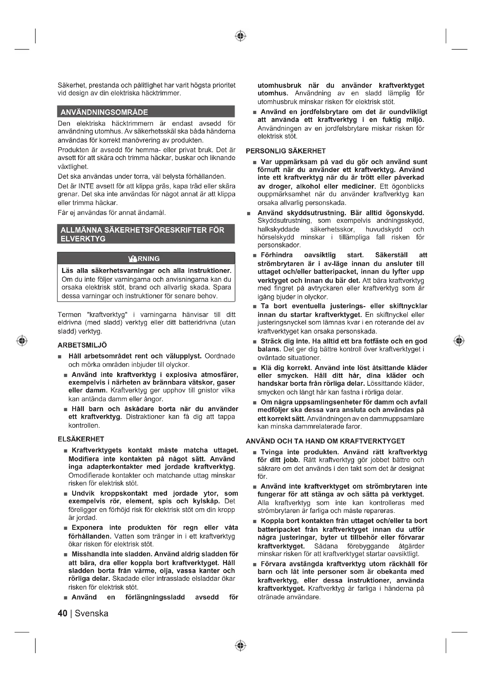 Den elektriska häcktrimmern är endast avsedd för användning utomhus. Av säkerhetsskäl ska båda händerna användas för korrekt manövrering av produkten. Produkten är avsedd för hemma- eller privat bruk. Det är avsett för att skära och trimma häckar, buskar och liknande växtlighet. Det ska användas under torra, väl belysta förhållanden. Det är INTE avsett för att klippa gräs, kapa träd eller skära grenar. Det ska inte användas för något annat är att klippa eller trimma häckar. Får ej användas för annat ändamål. ALLMÄNNA SÄKERHETSFÖRESKRIFTER FÖR ELVERKTYG VARNING Läs alla säkerhetsvarningar och alla instruktioner. Om du inte följer varningarna och anvisningarna kan du orsaka elektrisk stöt, brand och allvarlig skada. Spara dessa varningar och instruktioner för senare behov. Termen "kraftverktyg" i varningarna hänvisar till ditt eldrivna (med sladd) verktyg eller ditt batteridrivna (utan sladd) verktyg. ARBETSMILJÖ ■ Håll arbetsområdet rent och välupplyst. Oordnade och mörka områden inbjuder till olyckor. ■ Använd inte kraftverktyg i explosiva atmosfärer, exempelvis i närheten av brännbara vätskor, gaser eller damm. Kraftverktyg ger upphov till gnistor vilka kan antända damm eller ångor. ■ Håll barn och åskådare borta när du använder ett kraftverktyg. Distraktioner kan få dig att tappa kontrollen. ELSÄKERHET ■ Kraftverktygets kontakt måste matcha uttaget. Modifiera inte kontakten på något sätt. Använd inga adapterkontakter med jordade kraftverktyg. Omodifierade kontakter och matchande uttag minskar risken för elektrisk stöt. ■ Undvik kroppskontakt med jordade ytor, som exempelvis rör, element, spis och kylskåp. Det föreligger en förhöjd risk för elektrisk stöt om din kropp är jordad. ■ Exponera inte produkten för regn eller våta förhållanden. Vatten som tränger in i ett kraftverktyg ökar risken för elektrisk stöt. ■ Misshandla inte sladden. Använd aldrig sladden för att bära, dra eller koppla bort kraftverktyget. Håll sladden borta från värme, olja, vassa kanter och rörliga delar. Skadade eller intrasslade elsladdar ökar risken för elektrisk stöt. ■ Använd en förlängningssladd avsedd för utomhusbruk när du använder kraftverktyget utomhus. Användning av en sladd lämplig för utomhusbruk minskar risken för elektrisk stöt. ■ Använd en jordfelsbrytare om det är oundvlikligt att använda ett kraftverktyg i en fuktig miljö. Användningen av en jordfelsbrytare miskar risken för elektrisk stöt.