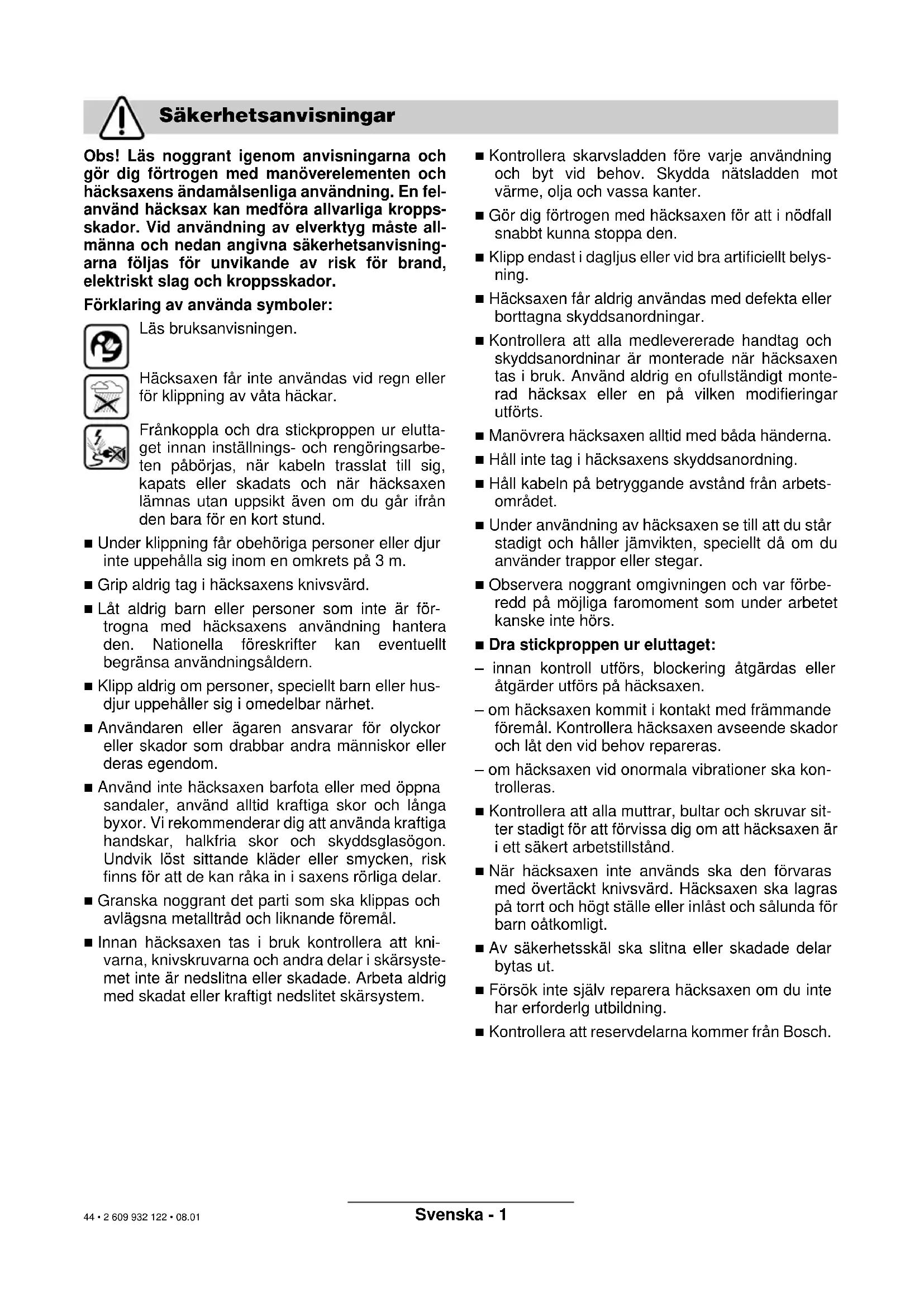 lavere en 96 dB (A) AHS 40/48/55/60/65, 98 dB (A) AHS 6000/7000. Proceducerer for overensstemmel- sesvurdering iht. bilag V. Leinfelden, 01.08.2001. Dr. Gerhard Felten Dr. Eckerhard Strötgen Robert Bosch GmbH, Geschäftsbereich Elektrowerkzeuge Ret til ændringer forbeholdes Service og reparation Miljøbeskyttelse Service og kunderådgiver Overensstemmelseserklæring 43 • 2 609 932 122 • 08.01Svenska - 1 Obs! Läs noggrant igenom anvisningarna och gör dig förtrogen med manöverelementen och häcksaxens ändamålsenliga användning. En fel- använd häcksax kan medföra allvarliga kropps- skador. Vid användning av elverktyg måste all- männa och nedan angivna säkerhetsanvisning- arna följas för unvikande av risk för brand, elektriskt slag och kroppsskador. Förklaring av använda symboler: Läs bruksanvisningen. Häcksaxen får inte användas vid regn eller för klippning av våta häckar. Frånkoppla och dra stickproppen ur elutta- get innan inställnings- och rengöringsarbe- ten påbörjas, när kabeln trasslat till sig, kapats eller skadats och när häcksaxen lämnas utan uppsikt även om du går ifrån den bara för en kort stund. ■ Under klippning får obehöriga personer eller djur inte uppehålla sig inom en omkrets på 3 m. ■ Grip aldrig tag i häcksaxens knivsvärd. ■ Låt aldrig barn eller personer som inte är för- trogna med häcksaxens användning hantera den. Nationella föreskrifter kan eventuellt begränsa användningsåldern. ■ Klipp aldrig om personer, speciellt barn eller hus- djur uppehåller sig i omedelbar närhet. ■ Användaren eller ägaren ansvarar för olyckor eller skador som drabbar andra människor eller deras egendom. ■ Använd inte häcksaxen barfota eller med öppna sandaler, använd alltid kraftiga skor och långa byxor. Vi rekommenderar dig att använda kraftiga handskar, halkfria skor och skyddsglasögon. Undvik löst sittande kläder eller smycken, risk finns för att de kan råka in i saxens rörliga delar. ■ Granska noggrant det parti som ska klippas och avlägsna metalltråd och liknande föremål. ■ Innan häcksaxen tas i bruk kontrollera att kni- varna, knivskruvarna och andra delar i skärsyste- met inte är nedslitna eller skadade. Arbeta aldrig med skadat eller kraftigt nedslitet skärsystem. ■ Kontrollera skarvsladden före varje användning och byt vid behov. Skydda nätsladden mot värme, olja och vassa kanter. ■ Gör dig förtrogen med häcksaxen för att i nödfall snabbt kunna stoppa den. ■ Klipp endast i dagljus eller vid bra artificiellt belys- ning. ■ Häcksaxen får aldrig användas med defekta eller borttagna skyddsanordningar. ■ Kontrollera att alla medlevererade handtag och skyddsanordninar är monterade när häcksaxen tas i bruk. Använd aldrig en ofullständigt monte- rad häcksax eller en på vilken modifieringar utförts. ■ Manövrera häcksaxen alltid med båda händerna. ■ Håll inte tag i häcksaxens skyddsanordning. ■ Håll kabeln på betryggande avstånd från arbets- området. ■ Under användning av häcksaxen se till att du står stadigt och håller jämvikten, speciellt då om du använder trappor eller stegar. ■ Observera noggrant omgivningen och var förbe- redd på möjliga faromoment som under arbetet kanske inte hörs. ■ Dra stickproppen ur eluttaget: – innan kontroll utförs, blockering åtgärdas eller åtgärder utförs på häcksaxen. – om häcksaxen kommit i kontakt med främmande föremål. Kontrollera häcksaxen avseende skador och låt den vid behov repareras. – om häcksaxen vid onormala vibrationer ska kon- trolleras. ■ Kontrollera att alla muttrar, bultar och skruvar sit- ter stadigt för att förvissa dig om att häcksaxen är i ett säkert arbetstillstånd. ■ När häcksaxen inte används ska den förvaras med övertäckt knivsvärd. Häcksaxen ska lagras på torrt och högt ställe eller inlåst och sålunda för barn oåtkomligt. ■ Av säkerhetsskäl ska slitna eller skadade delar bytas ut. ■ Försök inte själv reparera häcksaxen om du inte har erforderlg utbildning. ■ Kontrollera att reservdelarna kommer från Bosch. Säkerhetsanvisningar 44 • 2 609 932 122 • 08.01Svenska - 2 Häcksax AHS 40 - 24 AHS 48 - 24 AHS 55 - 24S AHS 60 - 24S Artikelnummer 0 600 845 0.. 0 600 845 1.. 0 600 845 2.. 0 600 845 4.. Upptagen effekt 500 W 500 W 550 W 550 W Slagtal på tomgång 1400 min