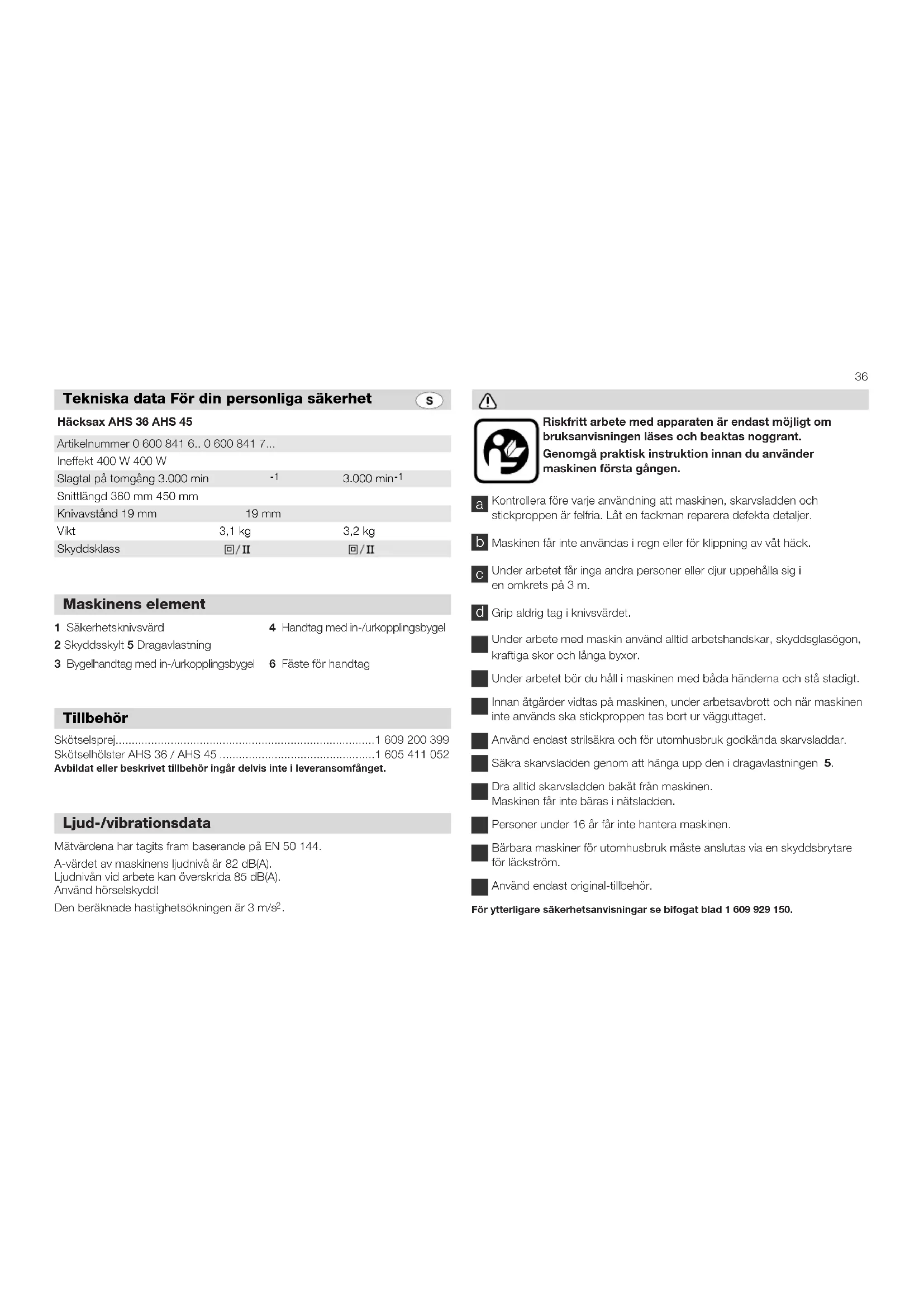 Dr. Eckerhard Strötgen Dr. Alfred Odendahl Robert Bosch GmbH, Geschäftsbereich Elektrowerkzeuge Konformitetserklæring36 1 Säkerhetsknivsvärd 4 Handtag med in-/urkopplingsbygel 2 Skyddsskylt 5 Dragavlastning 3 Bygelhandtag med in-/urkopplingsbygel 6 Fäste för handtag Maskinens element Tillbehör Tekniska data För din personliga säkerhet Skötselsprej................................................................................1 609 200 399 Skötselhölster AHS 36 / AHS 45 ................................................1 605 411 052 Avbildat eller beskrivet tillbehör ingår delvis inte i leveransomfånget. Mätvärdena har tagits fram baserande på EN 50 144. A-värdet av maskinens ljudnivå är 82 dB(A). Ljudnivån vid arbete kan överskrida 85 dB(A). Använd hörselskydd! Den beräknade hastighetsökningen är 3 m/s