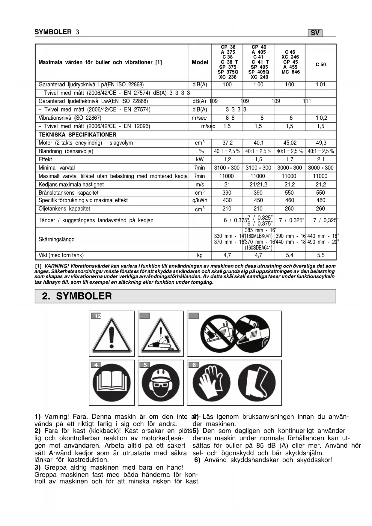 i deras ursprungliga position. Om maskinen används i anti-frost läge vid höga temperaturer kan det vara svårt att starta motorn och motorns hastighet kan vara felaktig. Kontrollera därför alltid att maskinen har återförts till funktionssättet normal (med sym- bolen "SOL" uppåt) ifall det inte längre finns risk för isbildning. ANMÄRKNINGKom alltid ihåg att en motor- såg som används felaktigt kan störa omgivningen och förstöra miljön. För respekt av andra och för miljön så: – Undvik att använda maskinen i miljöer och på tid- punkter då man kan störa. – Följ noggrant lokala bestämmelser för bortför- skaffande av material som finns kvar efter klipp- ningen. – Följ lokala bestämmelser noggrant för bortför- skaffande av olja, trasiga delar och andra enhe- ter som kan förstöra miljön. – Under arbetet så kommer en viss kvantitet olja hamna i miljön som är nödvändig för smörjning av kedjan, på grund av detta så använd endast biologiskt nedbrytbar olja. – För att undvika risk för brand så lämna inte ma- skinen med varm motor bland blad eller torkat gräs. Bär lämplig klädsel under arbetet. Er återförsäljare kan ge er information gällande mest lämplig säkerhetsutrustning för att förebygga olyckor och för att garantera sä- kerheten under arbetet. Använd anti-vibra- tionshandskar. Alla förebyggande åtgärder som har nämnts garanterar inte att man kan förhindra alla risker för Raynauds sjukdom eller karpaltunnelsyndrom. Vi rekommende- rar därför att personer som använder denna maskin under en längre tid regelbundet kon- trollerar tillståndet hos händer och fingrar. Om några av de ovan nämnda symtomen har uppstått måste du omedelbart kontakta en lä- kare. Användning av maskinen för fällning och kvistning kräver en specifik ut- bildning.