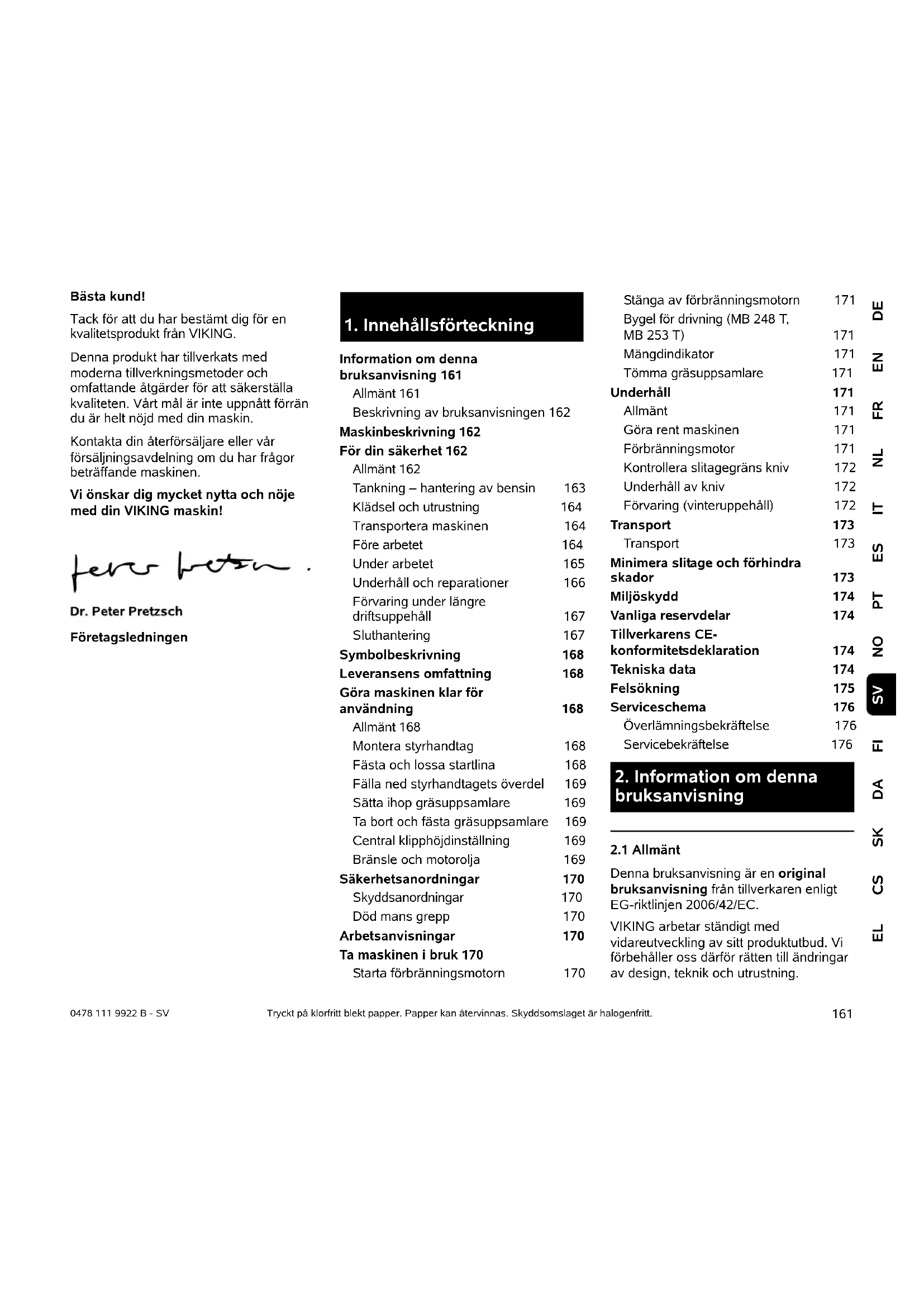 Denna bruksanvisning är en original bruksanvisning från tillverkaren enligt EG-riktlinjen 2006/42/EC. VIKING arbetar ständigt med vidareutveckling av sitt produktutbud. Vi förbehåller oss därför rätten till ändringar av design, teknik och utrustning. Tryckt på klorfritt blekt papper. Papper kan återvinnas. Skyddsomslaget är halogenfritt.
