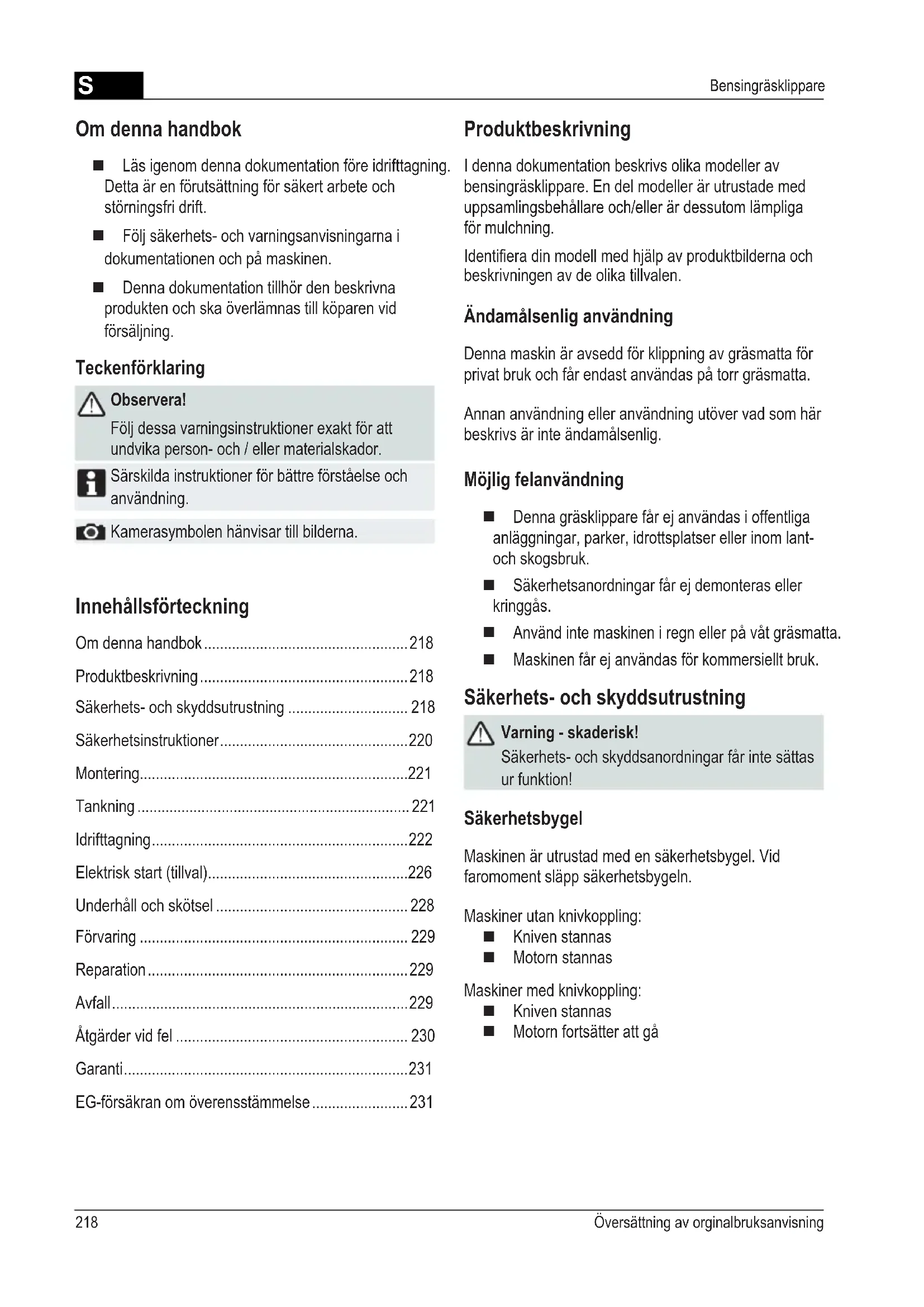 - Bensingräsklippare Innehållsförteckning Om denna handbok p. 218