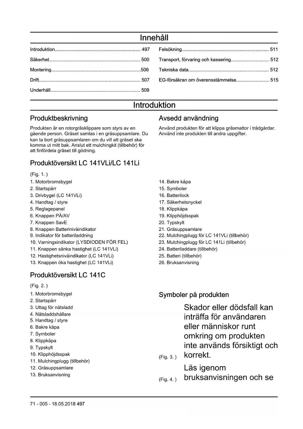 innan du använder produkten. (Fig. 5. ) Håll alltid människor och djur på säkert avstånd från arbetsområdet. (Fig. 6. ) Akta dig för utslungade föremål och rikoschetter. (Fig. 7. ) Varning! Håll händer och fötter borta från den roterande kniven. (Fig. 8. ) Varning! Håll händer och fötter borta från roterande delar. (Fig. 9. ) Ta ur tändningsnyckeln innan du utför underhåll på produkten. (modell LC 141VLi/LC 141Li) (Fig. 10. ) Koppla bort produkten från eluttaget innan du utför underhåll på produkten. (modell LC 141C) (Fig. 11. ) IPX1 – Produkten har skydd mot droppande vatten (modell LC 141VLi/ LC 141Li) (Fig. 12. ) IPX4 – Produkten har skydd mot vattenstänk (modell LC 141C) (Fig. 13. ) Låt inte regn falla på produkten (modell LC 141VLi/LC 141Li) (Fig. 14. ) Varning! Se till att produkten inte hamnar över nätsladden. Det kan orsaka elektriska stötar eller skada på produkten. (modell LC 141C) (Fig. 15. ) Denna produkt överensstämmer med gällande EG-direktiv. (Fig. 16. ) Bulleremissioner till omgivningen enligt Europeiska Gemenskapens direktiv. Produktens emission anges i avsnittet Tekniska data och på etiketten. (Fig. 17. ) Likström. 36 V (Fig. 18. ) Dubbelisolerad. (Fig.