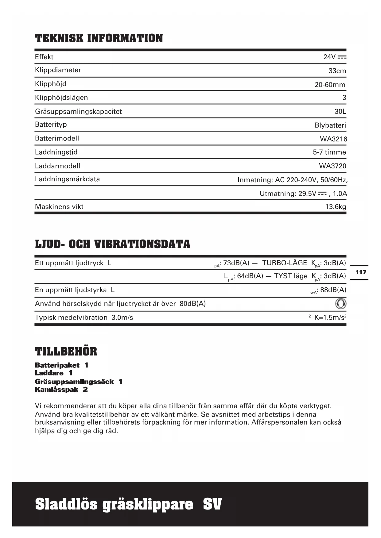 TILLBEHÖR Batteripaket 1 Laddare 1 Gräsuppsamlingssäck 1 Kamlåsspak 2 Vi rekommenderar att du köper alla dina tillbehör från samma affär där du köpte verktyget. Använd bra kvalitetstillbehör av ett välkänt märke. Se avsnittet med arbetstips i denna bruksanvisning eller tillbehörets förpackning för mer information. Affärspersonalen kan också hjälpa dig och ge dig råd. Effekt Klippdiameter Klipphöjd Klipphöjdslägen Gräsuppsamlingskapacitet Batterityp Batterimodell Laddningstid Laddarmodell Laddningsmärkdata Maskinens vikt TEKNISK INFORMATION 24V 33cm 20-60mm