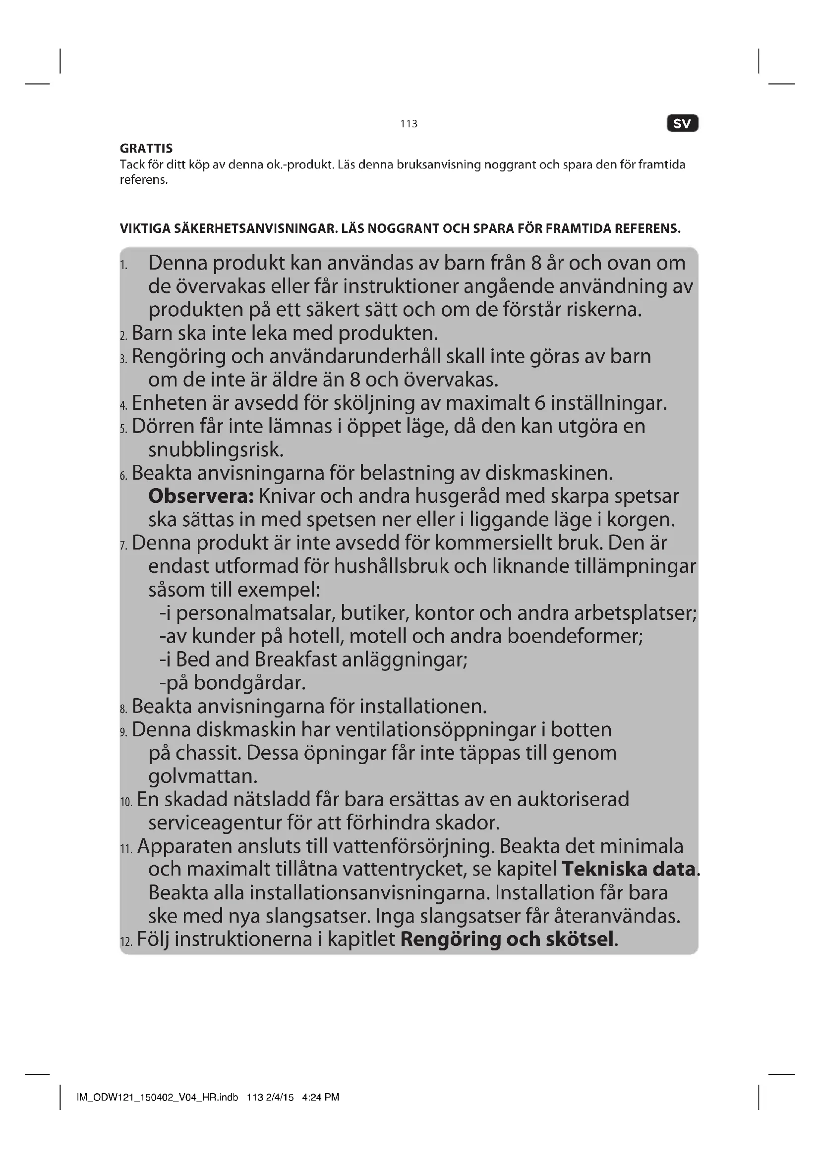 Denna produkt är endast avsedd för rengoring av porslin och redskap som är diskmaskinssäkra eller lämpliga för diskmaskin. Annan användning än den avsedda kan leda till skador på produkten eller personskador. Denna produkt är endast avsedd för hushållsbruk och inte avsedd för yrkesverksamhet. IM_ODW121_150402_V04_HR.indb 114 2/4/15 4:24 PM115
