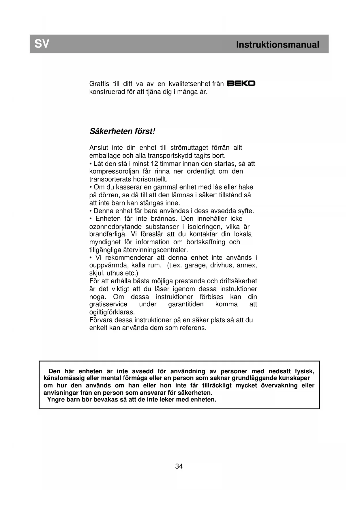 Den här enheten är inte avsedd för användning av personer med nedsatt fysisk, känslomässig eller mental förmåga eller en person som saknar grundläggande kunskaper om hur den används om han eller hon inte får tillräckligt mycket övervakning eller anvisningar från en person som ansvarar för säkerheten. Yngre barn bör bevakas så att de inte leker med enheten.SV Instruktionsmanual Elektriska krav Innan du sätter i väggkontakten bör du kontrollera att spänningen och frekvensen på klassificeringsplåten inuti enheten motsvarar ditt nät. Vi rekommenderar att denna enhet ansluts till huvudledningen via en korrekt kopplad och säkrad kontakt på en lättåtkomlig plats. Varning! Denna enhet måste jordas. Reparation av elektrisk utrustning bör endast utföras av en kvalificerad tekniker. Felaktigt utförda reparationer av en okvalificerad person medför risk för kritiska konsekvenser för den som använder enheten. OBSERVERA! Den här enheten drivs med R 600a som är en miljöanpassad, men antändbar gas. Under transport och fixering av produkten måste du iaktta försiktighet så att du inte skadar kylsystemet. Om kylsystemet skadas och det uppstår en gasläcka ska du hålla produkten på avstånd från öppen eld och vädra rummet en stund. VARNING - Använd inte mekaniska enheter eller andra sätt för att snabba på avfrostningsprocessen, förutom det som rekommenderas av tillverkaren. VARNING - Skada inte kylningskretsen. VARNING - Använd inga elektriska enheter inuti enhetens förvaringsutrymmen för mat, såvida dessa inte rekommenderats av tillverkaren. VARNING - Om huvudledningen är skadad måste den bytas av tillverkaren, tillverkarens serviceagent eller motsvarande kvalificerad person, för att fara skall undvikas. Transportinstruktioner