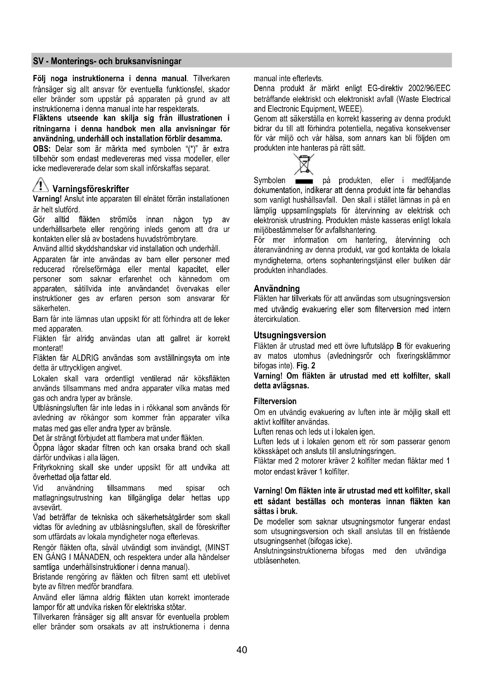 Etter å ha rengjort det, setter du det på plass i motsatt rekkefølge. Fettfilteret Fettfilteret må rengjøres en gang i måneden uten bruk av aggressive rengjøringsmidler, for hånd eller i oppvaskmaskin ved lav temperatur og med kort syklus. Ved vask i oppvaskmaskin kan fettfilteret i metall miste fargen, men dets filterkarakteristikker endres absolutt ikke. For å demontere fettfilteret må man dra i fjærhåndtaket. Fig. 9 Kullfilter (kun med resirkulering av luften) Holder tilbake ubehagelige lukter fra matlaging. Det er nødvendig med 2 kullfiltre til ventilatorer med 2 motorer og 1 kullfilter til ventilatorer med 1 motor. Kullfilteret må skiftes ut hver 4. måned ved middels bruk av ventilatoren, og oftere hvis ventilatoren brukes mye. Det kan IKKE vaskes eller benyttes om igjen Fig. 10 Plasser filteret slik at det dekker beskyttelsesristen over viftemotoren og vri deretter håndtaket P midt på filteret med urviseren. Filteret fjernes ved å vri håndtaket P midt på filteret mot urviseren. Utskifting av lyspærer Fig. 11 Koble apparatet fra elnettet. Merk! Forsikre deg om at lampen er kald før du tar i den. Slik kommer du til lyspærene: fjern lampedekslet ved å vippe det løs med en liten flat skrutrekker eller lignende. Skift ut den utbrukte pæren. Alt ettersom hvilken modell man har: Bruk olivenformede lyspærer på maks 40W (E14) eller halogenpærer på maks 20W (G4 12V). Monter lampedekslet igjen (det skal smekke på plass). Dersom belysningen ikke skulle virke, kontroller at lyspærene er satt korrekt på plass før du henvender deg til teknisk assistanse.40 SV - Monterings- och bruksanvisningar Följ noga instruktionerna i denna manual. Tillverkaren frånsäger sig allt ansvar för eventuella funktionsfel, skador eller bränder som uppstår på apparaten på grund av att instruktionerna i denna manual inte har respekterats. Fläktens utseende kan skilja sig från illustrationen i ritningarna i denna handbok men alla anvisningar för användning, underhåll och installation förblir desamma. OBS: Delar som är märkta med symbolen “(*)” är extra tillbehör som endast medlevereras med vissa modeller, eller icke medlevererade delar som skall införskaffas separat. Varningsföreskrifter Varning! Anslut inte apparaten till elnätet förrän installationen är helt slutförd. Gör alltid fläkten strömlös innan någon typ av underhållsarbete eller rengöring inleds genom att dra ur kontakten eller slå av bostadens huvudströmbrytare. Använd alltid skyddshandskar vid installation och underhåll. Apparaten får inte användas av barn eller personer med reducerad rörelseförmåga eller mental kapacitet, eller personer som saknar erfarenhet och kännedom om apparaten, såtillvida inte användandet övervakas eller instruktioner ges av erfaren person som ansvarar för säkerheten. Barn får inte lämnas utan uppsikt för att förhindra att de leker med apparaten. Fläkten får alridg användas utan att gallret är korrekt monterat! Fläkten får ALDRIG användas som avställningsyta om inte detta är uttryckligen angivet. Lokalen skall vara ordentligt ventilerad när köksfläkten används tillsammans med andra apparater vilka matas med gas och andra typer av bränsle. Utblåsningsluften får inte ledas in i rökkanal som används för avledning av rökångor som kommer från apparater vilka matas med gas eller andra typer av bränsle. Det är strängt förbjudet att flambera mat under fläkten. Öppna lågor skadar filtren och kan orsaka brand och skall därför undvikas i alla lägen. Frityrkokning skall ske under uppsikt för att undvika att överhettad olja fattar eld. Vid användning tillsammans med spisar och matlagningsutrustning kan tillgängliga delar hettas upp avsevärt. Vad beträffar de tekniska och säkerhetsåtgärder som skall vidtas för avledning av utblåsningsluften, skall de föreskrifter som utfärdats av lokala myndigheter noga efterlevas. Rengör fläkten ofta, såväl utvändigt som invändigt, (MINST EN GÅNG I MÅNADEN, och respektera under alla händelser samtliga underhållsinstruktioner i denna manual). Bristande rengöring av fläkten och filtren samt ett uteblivet byte av filtren medför brandfara. Använd eller lämna aldrig fläkten utan korrekt imonterade lampor för att undvika risken för elektriska stötar. Tillverkaren frånsäger sig allt ansvar för eventuella problem eller bränder som orsakats av att instruktionerna i denna manual inte efterlevts. Denna produkt är märkt enligt EG-direktiv 2002/96/EEC beträffande elektriskt och elektroniskt avfall (Waste Electrical and Electronic Equipment, WEEE). Genom att säkerställa en korrekt kassering av denna produkt bidrar du till att förhindra potentiella, negativa konsekvenser för vår miljö och vår hälsa, som annars kan bli följden om produkten inte hanteras på rätt sätt. Symbolen på produkten, eller i medföljande dokumentation, indikerar att denna produkt inte får behandlas som vanligt hushållsavfall. Den skall i stället lämnas in på en lämplig uppsamlingsplats för återvinning av elektrisk och elektronisk utrustning. Produkten måste kasseras enligt lokala miljöbestämmelser för avfallshantering. För mer information om hantering, återvinning och återanvändning av denna produkt, var god kontakta de lokala myndigheterna, ortens sophanteringstjänst eller butiken där produkten inhandlades. Användning Fläkten har tillverkats för att användas som utsugningsversion med utvändig evakuering eller som filterversion med intern återcirkulation. Utsugningsversion Fläkten är utrustad med ett övre luftutsläpp B för evakuering av matos utomhus (avledningsrör och fixeringsklämmor bifogas inte). Fig. 2 Varning! Om fläkten är utrustad med ett kolfilter, skall detta avlägsnas. Filterversion Om en utvändig evakuering av luften inte är möjlig skall ett aktivt kolfilter användas. Luften renas och leds ut i lokalen igen. Luften leds ut i lokalen genom