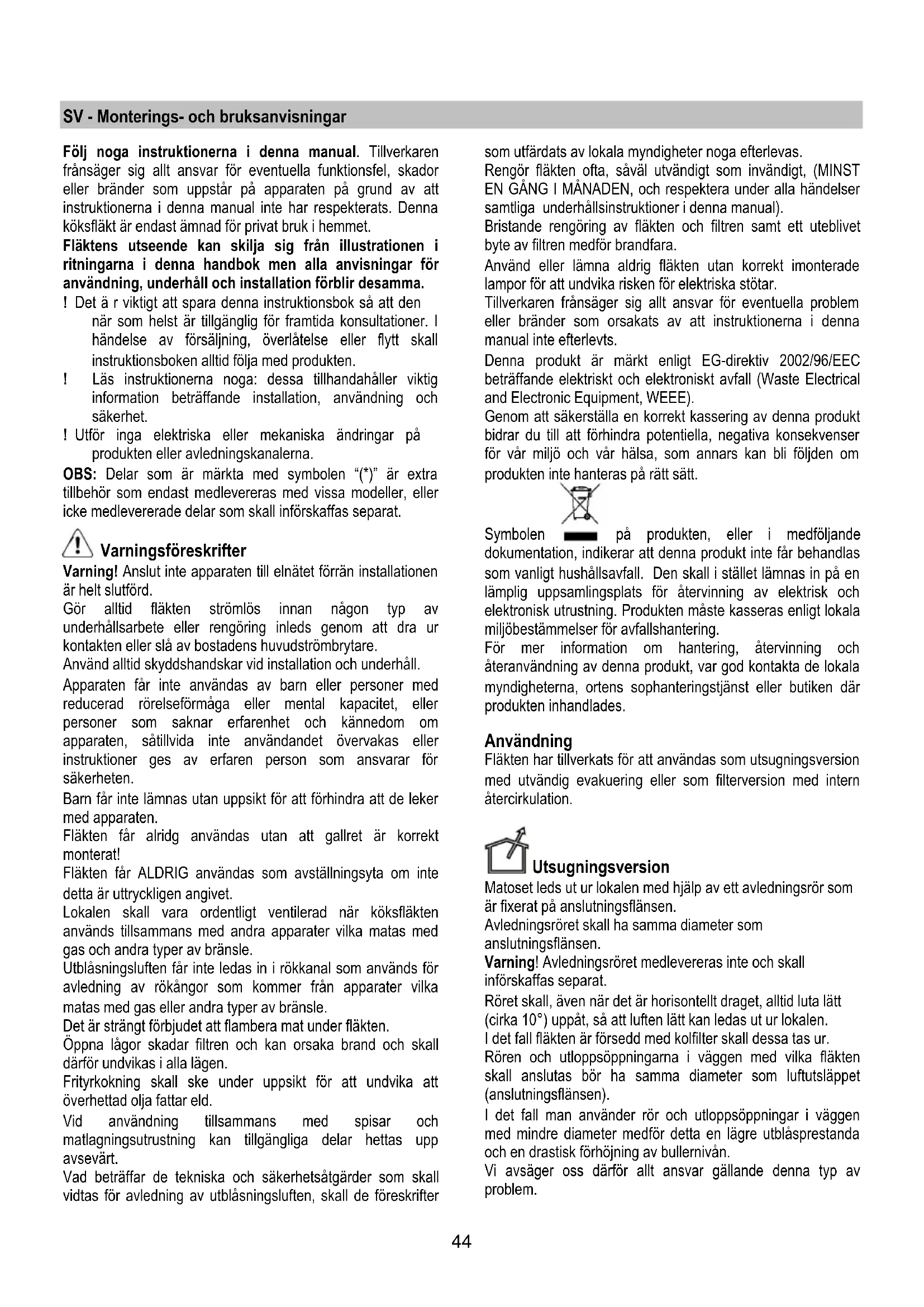 Dersom belysningen ikke skulle virke, kontroller at lyspærene er satt korrekt på plass før du henvender deg til teknisk assistanse.44 SV - Monterings- och bruksanvisningar Följ noga instruktionerna i denna manual. Tillverkaren frånsäger sig allt ansvar för eventuella funktionsfel, skador eller bränder som uppstår på apparaten på grund av att instruktionerna i denna manual inte har respekterats. Denna köksfläkt är endast ämnad för privat bruk i hemmet. Fläktens utseende kan skilja sig från illustrationen i ritningarna i denna handbok men alla anvisningar för användning, underhåll och installation förblir desamma. ! Det ä r viktigt att spara denna instruktionsbok så att den när som helst är tillgänglig för framtida konsultationer. I händelse av försäljning, överlåtelse eller flytt skall instruktionsboken alltid följa med produkten. ! Läs instruktionerna noga: dessa tillhandahåller viktig information beträffande installation, användning och säkerhet. ! Utför inga elektriska eller mekaniska ändringar på produkten eller avledningskanalerna. OBS: Delar som är märkta med symbolen “(*)” är extra tillbehör som endast medlevereras med vissa modeller, eller icke medlevererade delar som skall införskaffas separat. Varningsföreskrifter Varning! Anslut inte apparaten till elnätet förrän installationen är helt slutförd. Gör alltid fläkten strömlös innan någon typ av underhållsarbete eller rengöring inleds genom att dra ur kontakten eller slå av bostadens huvudströmbrytare. Använd alltid skyddshandskar vid installation och underhåll. Apparaten får inte användas av barn eller personer med reducerad rörelseförmåga eller mental kapacitet, eller personer som saknar erfarenhet och kännedom om apparaten, såtillvida inte användandet övervakas eller instruktioner ges av erfaren person som ansvarar för säkerheten. Barn får inte lämnas utan uppsikt för att förhindra att de leker med apparaten. Fläkten får alridg användas utan att gallret är korrekt monterat! Fläkten får ALDRIG användas som avställningsyta om inte detta är uttryckligen angivet. Lokalen skall vara ordentligt ventilerad när köksfläkten används tillsammans med andra apparater vilka matas med gas och andra typer av bränsle. Utblåsningsluften får inte ledas in i rökkanal som används för avledning av rökångor som kommer från apparater vilka matas med gas eller andra typer av bränsle. Det är strängt förbjudet att flambera mat under fläkten. Öppna lågor skadar filtren och kan orsaka brand och skall därför undvikas i alla lägen. Frityrkokning skall ske under uppsikt för att undvika att överhettad olja fattar eld. Vid användning tillsammans med spisar och matlagningsutrustning kan tillgängliga delar hettas upp avsevärt. Vad beträffar de tekniska och säkerhetsåtgärder som skall vidtas för avledning av utblåsningsluften, skall de föreskrifter som utfärdats av lokala myndigheter noga efterlevas. Rengör fläkten ofta, såväl utvändigt som invändigt, (MINST EN GÅNG I MÅNADEN, och respektera under alla händelser samtliga underhållsinstruktioner i denna manual). Bristande rengöring av fläkten och filtren samt ett uteblivet byte av filtren medför brandfara. Använd eller lämna aldrig fläkten utan korrekt imonterade lampor för att undvika risken för elektriska stötar. Tillverkaren frånsäger sig allt ansvar för eventuella problem eller bränder som orsakats av att instruktionerna i denna manual inte efterlevts. Denna produkt är märkt enligt EG-direktiv 2002/96/EEC beträffande elektriskt och elektroniskt avfall (Waste Electrical and Electronic Equipment, WEEE). Genom att säkerställa en korrekt kassering av denna produkt bidrar du till att förhindra potentiella, negativa konsekvenser för vår miljö och vår hälsa, som annars kan bli följden om produkten inte hanteras på rätt sätt. Symbolen på produkten, eller i medföljande dokumentation, indikerar att denna produkt inte får behandlas som vanligt hushållsavfall. Den skall i stället lämnas in på en lämplig uppsamlingsplats för återvinning av elektrisk och elektronisk utrustning. Produkten måste kasseras enligt lokala miljöbestämmelser för avfallshantering. För mer information om hantering, återvinning och återanvändning av denna produkt, var god kontakta de lokala myndigheterna, ortens sophanteringstjänst eller butiken där produkten inhandlades. Användning Fläkten har tillverkats för att användas som utsugningsversion med utvändig evakuering eller som filterversion med intern återcirkulation. Utsugningsversion Matoset leds ut ur lokalen med hjälp av ett avledningsrör som är fixerat på anslutningsflänsen. Avledningsröret skall ha samma diameter som anslutningsflänsen. Varning! Avledningsröret medlevereras inte och skall införskaffas separat. Röret skall, även när det är horisontellt draget, alltid luta lätt (cirka 10°) uppåt, så att luften lätt kan ledas ut ur lokalen. I det fall fläkten är försedd med kolfilter skall dessa tas ur. Rören och utloppsöppningarna i väggen med vilka fläkten skall anslutas bör ha samma diameter som luftutsläppet (anslutningsflänsen). I det fall man använder rör och utloppsöppningar i väggen med mindre diameter medför detta en lägre utblåsprestanda och en drastisk förhöjning av bullernivån. Vi avsäger oss därför allt ansvar gällande denna typ av problem.45 ! Använd ett så kort rör som möjligt. ! Röret skall vara så rakt som möjligt (högsta tillåtna vinkel på böjarna 90°). ! Undvik stora skillnader i rörets tvärsnittsarea. ! Använd rör vars insida är så slät som möjligt. ! Röret skall vara tillverkat av i lag godkända material. Filterversion Den utsugna luften avfettas och befrias från odörer innan den leds ut i lokalen igen. När fläkten används med denna version är det nödvändigt att installera ett extra aktivt kolfiltersystem. De modeller s