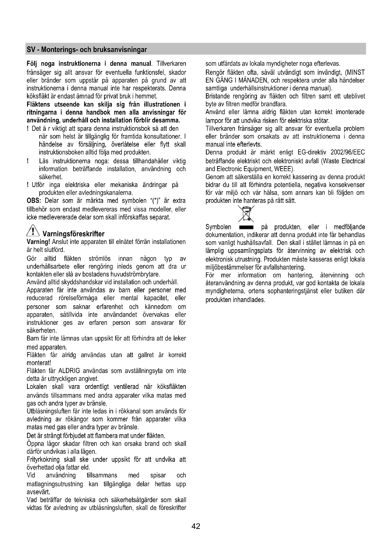 Följ noga instruktionerna ienna manual. Tillverkaren fransager sig allt ansvar for eventuella funktionsfel, skador ellbrander som uppstar pa apparaten na ground av att instruktionerna ienna manual inte har respekterats. Denna koksflakt ar endast amnad for privat bruk i hemmet.