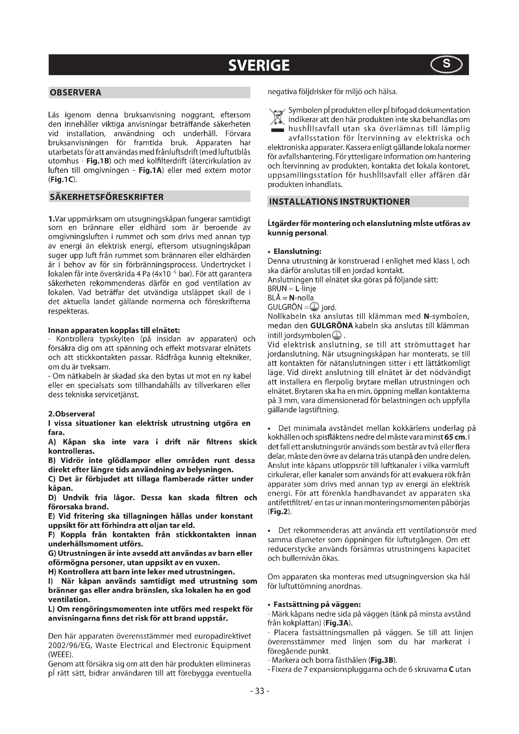 bränner gas eller andra bränslen, ska lokalen ha en god ventilation. L) Om rengöringsmomenten inte utförs med respekt för anvisningarna nns det risk för att brand uppstår. Den här apparaten överensstämmer med europadirektivet 2002/96/EG, Waste Electrical and Electronic Equipment (WEEE). Genom att försäkra sig om att den här produkten elimineras pĺ rätt sätt, bidrar användaren till att förebygga eventuella negativa följdrisker för miljö och hälsa. Symbolen pĺ produkten eller pĺ bifogad dokumentation indikerar att den här produkten inte ska behandlas om hushĺllsavfall utan ska överlämnas till lämplig avfallsstation för ĺtervinning av elektriska och elektroniska apparater. Kassera enligt gällande lokala normer för avfallshantering. För ytterligare information om hantering och ĺtervinning av produkten, kontakta det lokala kontoret, uppsamllingsstation för hushĺllsavfall eller affären där produkten inhandlats. INSTALLATIONS INSTRUKTIONER Ĺtgärder för montering och elanslutning mĺste utföras av kunnig personal.