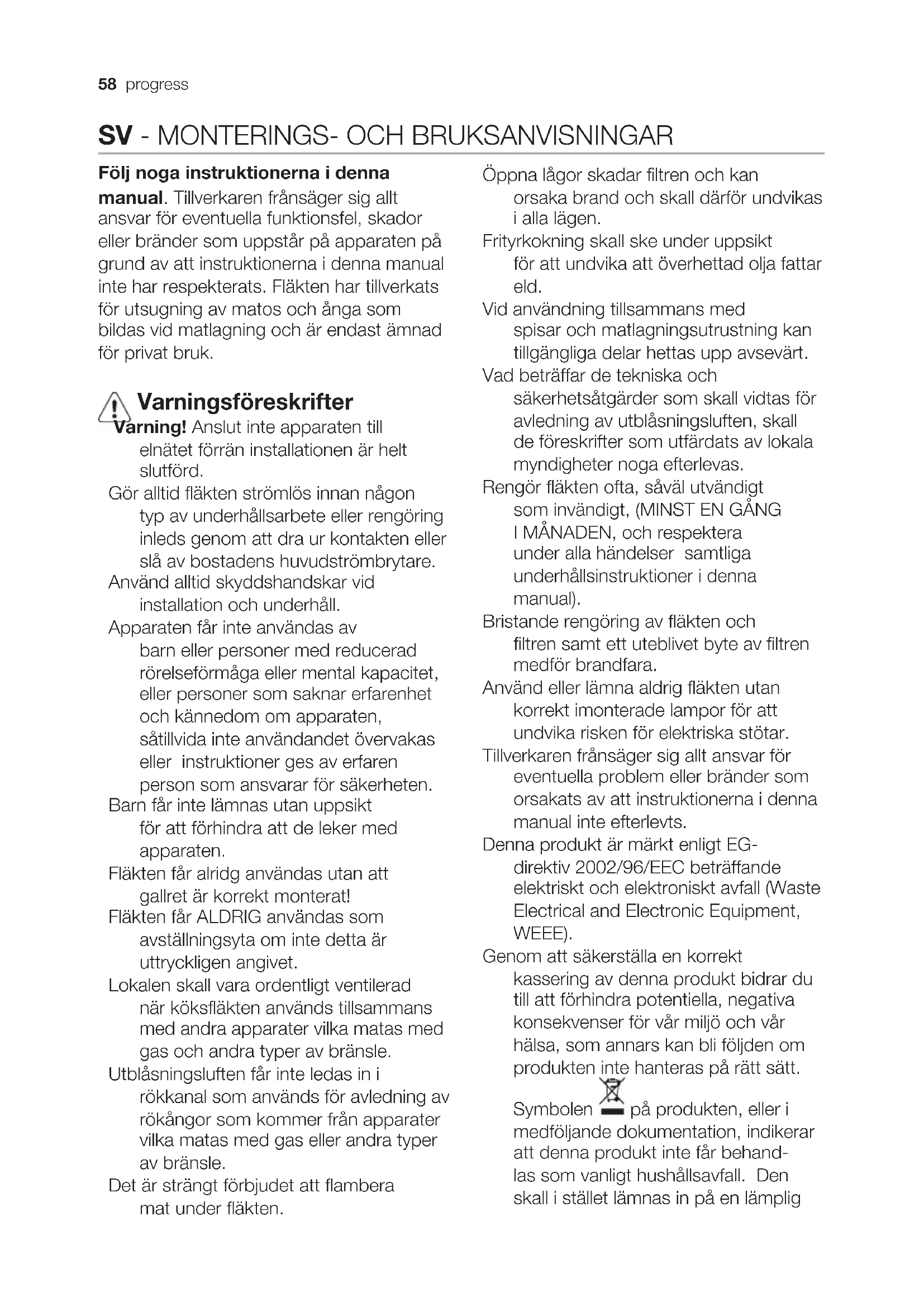 Följ noga instruktionerna i denna manual. Tillverkaren frånsäger sig allt ansvar för eventuella funktionsfel, skador eller bränder som uppstår på apparaten på grund av att instruktionerna i denna manual inte har respekterats. Fläkten har tillverkats för utsugning av matos och ånga som bildas vid matlagning och är endast ämnad för privat bruk. Varningsföreskrifter Varning! Anslut inte apparaten till elnätet förrän installationen är helt slutförd. Gör alltid fläkten strömlös innan någon typ av underhållsarbete eller rengöring inleds genom att dra ur kontakten eller slå av bostadens huvudströmbrytare. Använd alltid skyddshandskar vid installation och underhåll. Apparaten får inte användas av barn eller personer med reducerad rörelseförmåga eller mental kapacitet, eller personer som saknar erfarenhet och kännedom om apparaten, såtillvida inte användandet övervakas eller instruktioner ges av erfaren person som ansvarar för säkerheten. Barn får inte lämnas utan uppsikt för att förhindra att de leker med apparaten. Fläkten får alridg användas utan att gallret är korrekt monterat! Fläkten får ALDRIG användas som avställningsyta om inte detta är uttryckligen angivet. Lokalen skall vara ordentligt ventilerad när köksfläkten används tillsammans med andra apparater vilka matas med gas och andra typer av bränsle. Utblåsningsluften får inte ledas in i rökkanal som används för avledning av rökångor som kommer från apparater vilka matas med gas eller andra typer av bränsle. Det är strängt förbjudet att flambera mat under fläkten. Öppna lågor skadar filtren och kan orsaka brand och skall därför undvikas i alla lägen. Frityrkokning skall ske under uppsikt för att undvika att överhettad olja fattar eld. Vid användning tillsammans med spisar och matlagningsutrustning kan tillgängliga delar hettas upp avsevärt. Vad beträffar de tekniska och säkerhetsåtgärder som skall vidtas för avledning av utblåsningsluften, skall de föreskrifter som utfärdats av lokala myndigheter noga efterlevas. Rengör fläkten ofta, såväl utvändigt som invändigt, (MINST EN GÅNG I MÅNADEN, och respektera under alla händelser samtliga underhållsinstruktioner i denna manual). Bristande rengöring av fläkten och filtren samt ett uteblivet byte av filtren medför brandfara. Använd eller lämna aldrig fläkten utan korrekt imonterade lampor för att undvika risken för elektriska stötar. Tillverkaren frånsäger sig allt ansvar för eventuella problem eller bränder som orsakats av att instruktionerna i denna manual inte efterlevts. Denna produkt är märkt enligt EG- direktiv 2002/96/EEC beträffande elektriskt och elektroniskt avfall (Waste Electrical and Electronic Equipment, WEEE). Genom att säkerställa en korrekt kassering av denna produkt bidrar du till att förhindra potentiella, negativa konsekvenser för vår miljö och vår hälsa, som annars kan bli följden om produkten inte hanteras på rätt sätt. Symbolen på produkten, eller i medföljande dokumentation, indikerar att denna produkt inte får behand- las som vanligt hushållsavfall. Den skall i stället lämnas in på en lämpligprogress 59 uppsamlingsplats för återvinning av elektrisk och elektronisk utrustning. Produkten måste kasseras enligt loka- la miljöbestämmelser för avfallshanter- ing. För mer information om hantering, återvinning och återanvändning av denna produkt, var god kontakta de lokala myndigheterna, ortens sophanteringstjänst eller butiken där produkten inhandlades. Användning Fläkten har tillverkats för att användas som utsugningsversion med utvändig evakuer- ing eller som fi lterversion med intern återcirkulation . Installation Denna typ av fl äkt skall fi xeras i taket. Produkt med hög vikt. För fl yttning och installation av fl äktkåpan krävs minst två personer. Minsta tillåtna avstånd mellan kokkärlens stödyta på spishällen och köksfl äktes underkant är 40cm om det är frågan om en elektrisk spis och 55cm om det är frågan om gasspis eller kombinerad gashäll. Om spishällens instruktioner anger ett större avstånd skall detta respekteras. Nätspänningen skall motsvara spänningen som anges på märkplåten som sitter inne i fl äkten. Om fl äkten är utrustad med stickkontakt skall denna anslutas till ett uttag som är lättillgängligt även efter installationen och som uppfyller gällande föreskrifter. I det fall fl äkten saknar stickkontakt (direktanslutning till nätet), eller om uttaget är placerat på en svåråtkomlig plats skall en godkänd tvåpolig strömbrytare installeras som garanterar en fullkomlig frånkoppling från nätet i samband med överspänningsklass III, i enlighet med installationsbestämmelserna. Varning! kontrollera innan fläktens krets ansluts med nätspänningen att den fungerar korrekt och är korrekt monterad. Fläkten är försedd med en speciell elkabel, kontakta därför vårt tekniska servicekontor i det kabeln skadats. Funktion Använd en högre hastighet om matoset är mycket koncentrerat. Vi rekommenderar att starta luftevakueringen 5 minuter innan matlagningen inleds och låta den fungera i cirka 15 minuter efter avslutad matlagning. T1T6 T2 T3 T4 T5 L1 L3 L2 L4 T1. ON/OFF Belysning T2. Hastighetssänkning Tryck på tangenten “T2” för att sänka hastigheten från hastighet 4 (intensiv) till hastighet 1. Tryck på tangenten “T2” för att stänga av fläkten OFF när fden fungerar med hastighet 1. T3. Hastighetshöjning Tryck på tangenten T3 för att slå på den avstängda fläkten OFF med hastighet 1. Tryck på tangenten (fläkten är påslagen ON) för att höja motorns hastighet från hastighet 1 till intensivhastigheten (tidsbegränsad)). Hastighet 1 lysdiod L1 Hastighet 2 lysdiod L1+L2 Hastighet 3 lysdiod L1+L2+L3 Intensivhastighet (tidsbegränsad) blinkande lysdiod L1+L2+L3+L4 OBS: Hastighet 4 (intensiv tidsbegränsad) fungerar i 5 minuter varefter fläk
