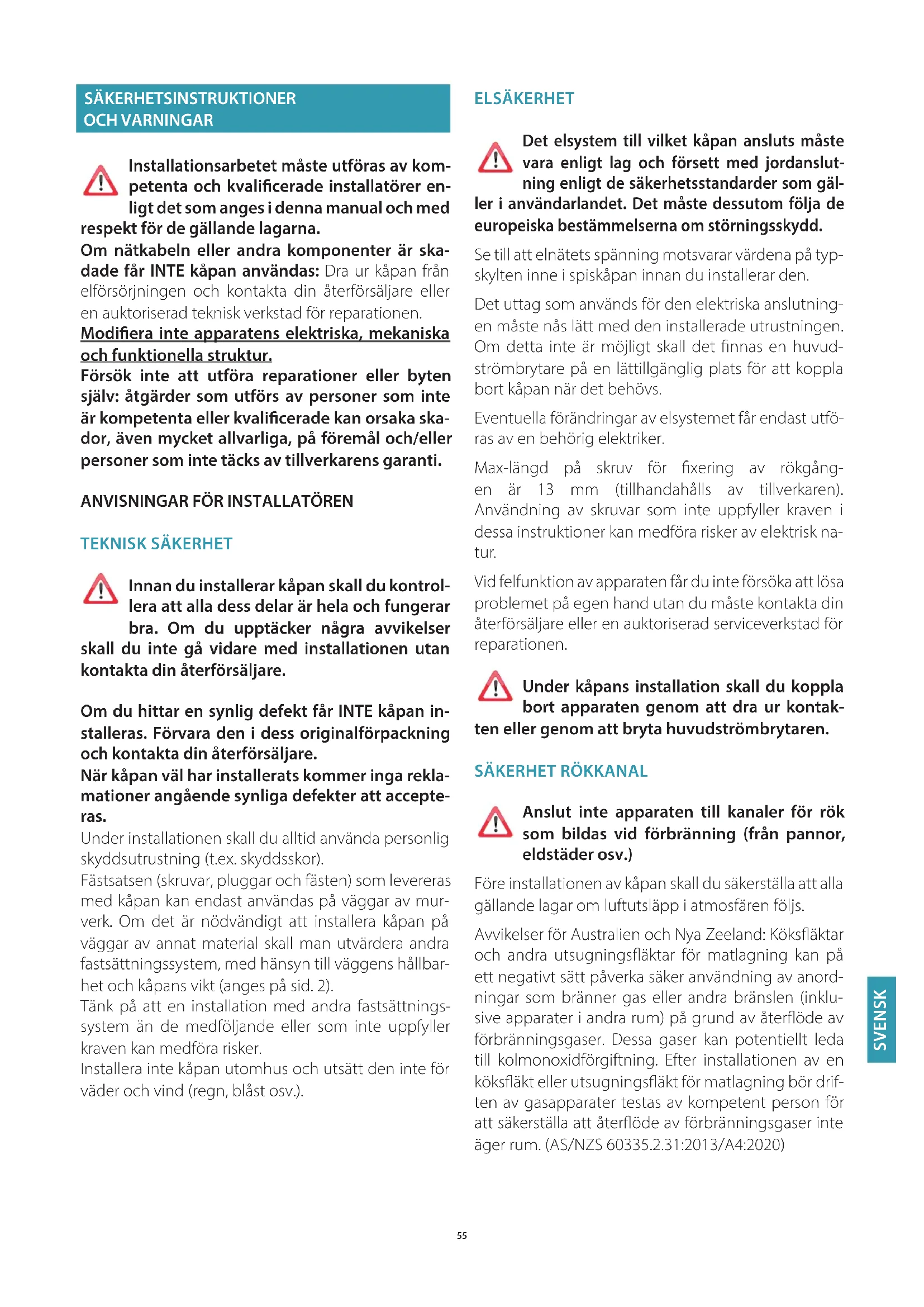 Anslut inte apparaten till kanaler för rök som bildas vid förbränning (från pannor, eldstäder osv.) Före installationen av kåpan skall du säkerställa att alla gällande lagar om luftutsläpp i atmosfären följs. Avvikelser för Australien och Nya Zeeland: Köksäktar och andra utsugningsäktar för matlagning kan på ett negativt sätt påverka säker användning av anord- ningar som bränner gas eller andra bränslen (inklu- sive apparater i andra rum) på grund av återöde av förbränningsgaser. Dessa gaser kan potentiellt leda till kolmonoxidförgiftning. Efter installationen av en köksäkt eller utsugningsäkt för matlagning bör drif- ten av gasapparater testas av kompetent person för att säkerställa att återöde av förbränningsgaser inte äger rum. (AS/NZS 60335.2.31:2013/A4:2020)56
