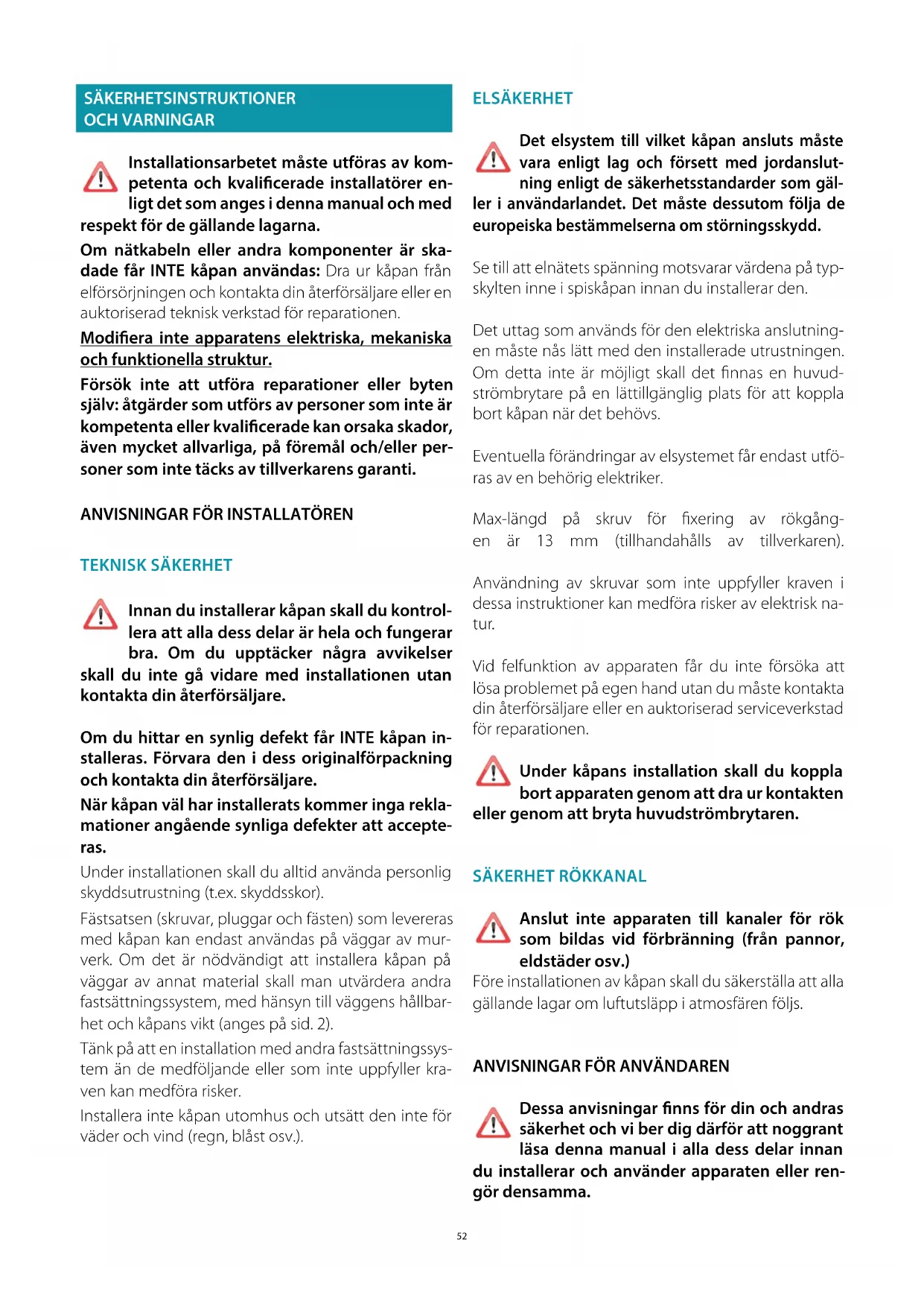 Symbolet med den overstregede skraldespand er kun gyldigt i EU- medlemslande: Vi anbefaler vores kunder at tage kontakt til de lokale myndigheder, eller til forretningen hvor apparatet er købt, for nærmere oplysninger vedrørende den korrekte bortskaelse. PAS PÅ! Producenten forbeholder sig ret til at foretage ændringer på udstyret, til enhver tid og uden varsel. Genoptryk, oversættelse og reproduktion, også delvis, af denne vejledning er underlagt tilladelse fra fabrikanten. De tekniske informationer, de graske gengivelser og specikationerne i denne vejledning er vejledende og må ikke oentliggøres. Vejledningen er blevet udformet på italiensk og Fabrikanten fralægger sig ansvaret for eventuel fejlagtig afskrivning eller oversættelse.52 SÄKERHETSINSTRUKTIONER OCH VARNINGAR Installationsarbetet måste utföras av kom- petenta och kvalicerade installatörer en- ligt det som anges i denna manual och med respekt för de gällande lagarna. Om nätkabeln eller andra komponenter är ska- dade får INTE kåpan användas: Dra ur kåpan från elförsörjningen och kontakta din återförsäljare eller en auktoriserad teknisk verkstad för reparationen. Modiera inte apparatens elektriska, mekaniska och funktionella struktur. Försök inte att utföra reparationer eller byten själv: åtgärder som utförs av personer som inte är kompetenta eller kvalicerade kan orsaka skador, även mycket allvarliga, på föremål och/eller per- soner som inte täcks av tillverkarens garanti.