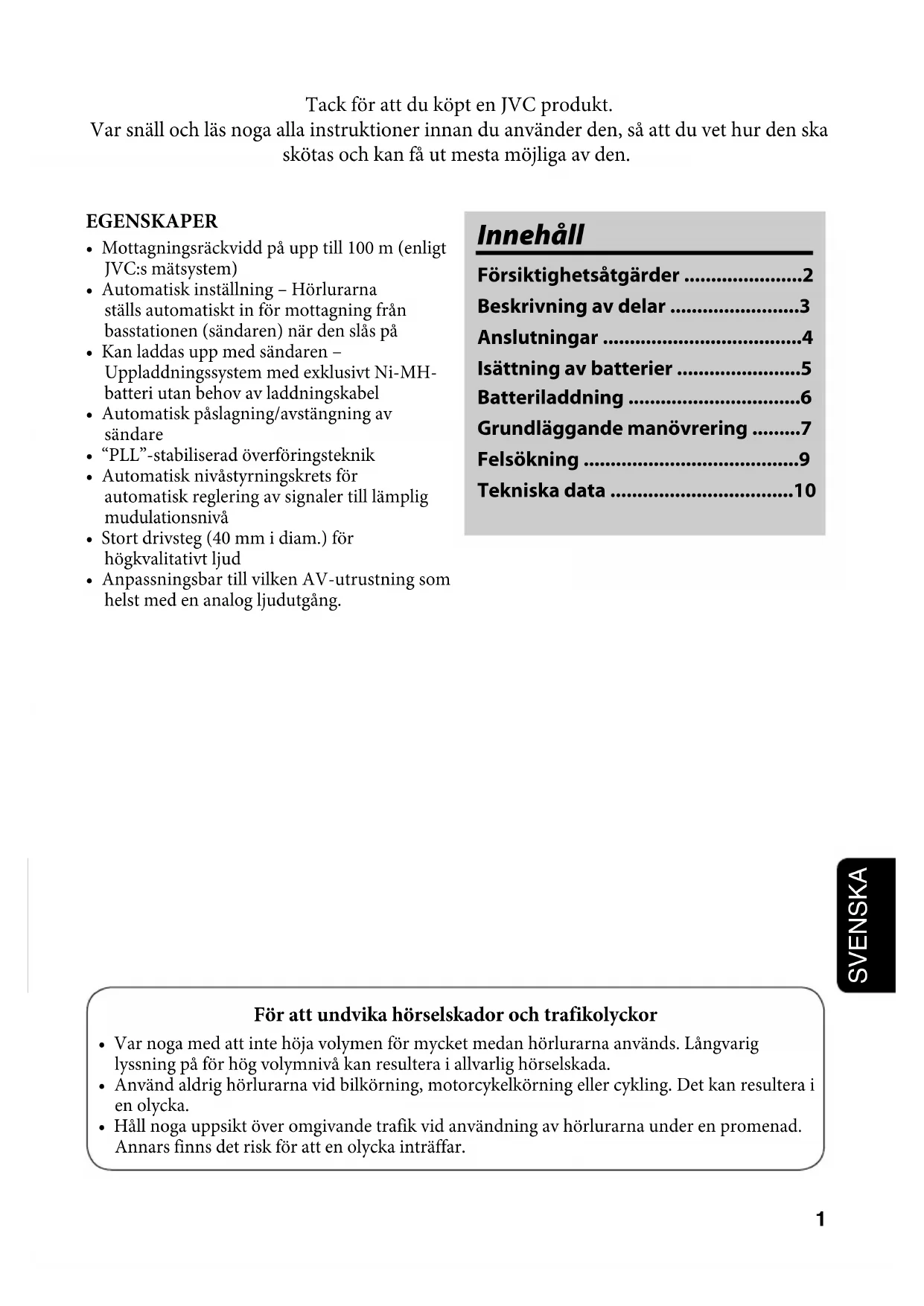 - L’aspetto e le caratteristiche del prodotto sono soggetti a modifiche senza preavviso. (IT)HAW600_G.indd 10(IT)HAW600_G.indd 10 7/11/06 11:43:15 AM7/11/06 11:43:15 AM1 SVENSKA Innehåll Försiktighetsåtgärder ......................2 Beskrivning av delar ........................3 Anslutningar .....................................4 Isättning av batterier .......................5 Batteriladdning ................................6 Grundläggande manövrering .........7 Felsökning ........................................9 Tekniska data ..................................10 Tack för att du köpt en JVC produkt. Var snäll och läs noga alla instruktioner innan du använder den, så att du vet hur den ska skötas och kan få ut mesta möjliga av den. För att undvika hörselskador och trafikolyckor