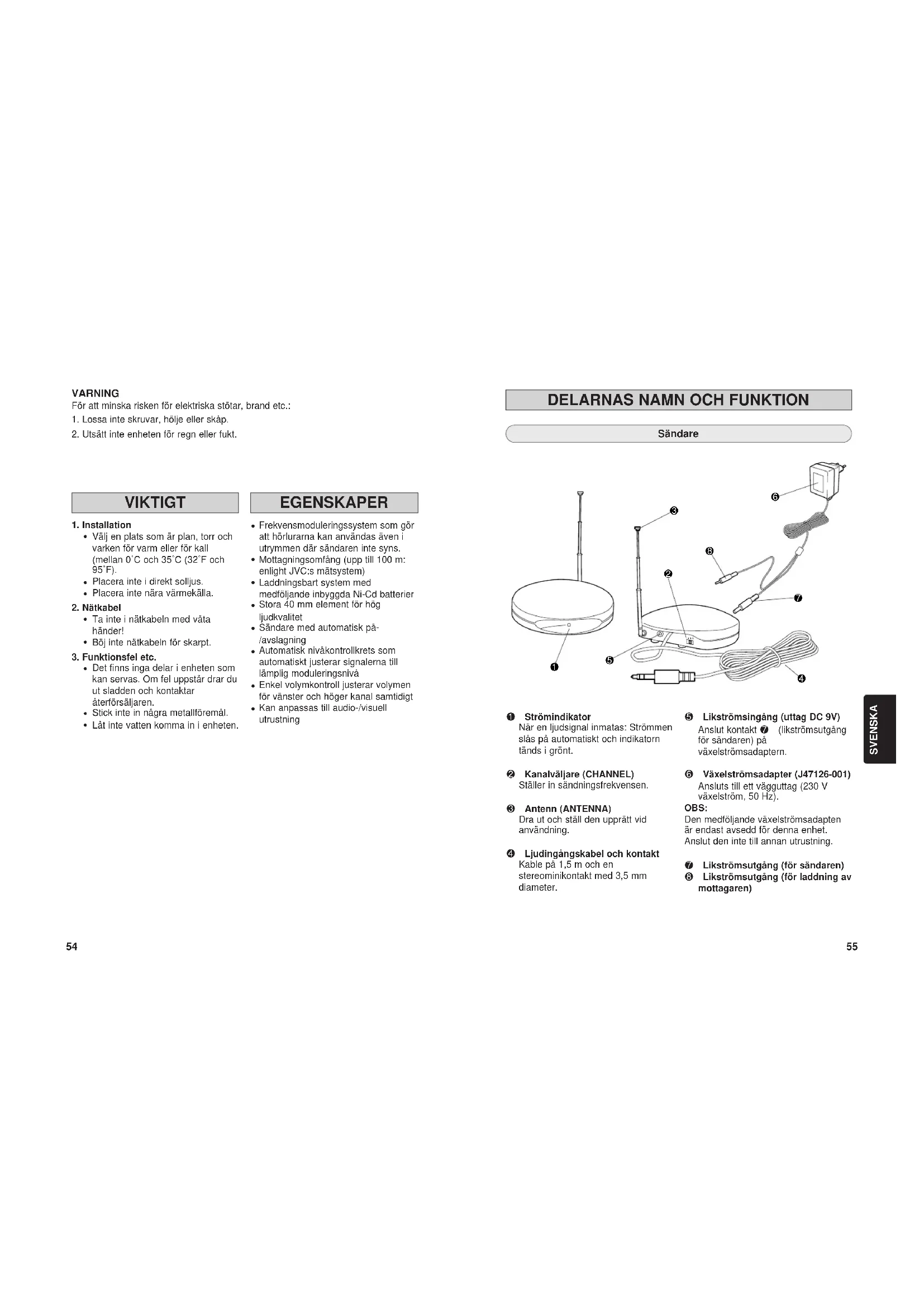Sändare 1 Strömindikator När en ljudsignal inmatas: Strömmen slås på automatiskt och indikatorn tänds i grönt. 2 Kanalväljare (CHANNEL) Ställer in sändningsfrekvensen. 3 Antenn (ANTENNA) Dra ut och ställ den upprätt vid användning. 4 Ljudingångskabel och kontakt Kable på 1,5 m och en stereominikontakt med 3,5 mm diameter. 5 Likströmsingång (uttag DC 9V) Anslut kontakt 7 (likströmsutgång för sändaren) på växelströmsadaptern. 6 Växelströmsadapter (J47126-001) Ansluts till ett vägguttag (230 V växelström, 50 Hz). OBS: Den medföljande växelströmsadapten är endast avsedd för denna enhet. Anslut den inte till annan utrustning. 7 Likströmsutgång (för sändaren) 8 Likströmsutgång (för laddning av mottagaren) SVENSKA