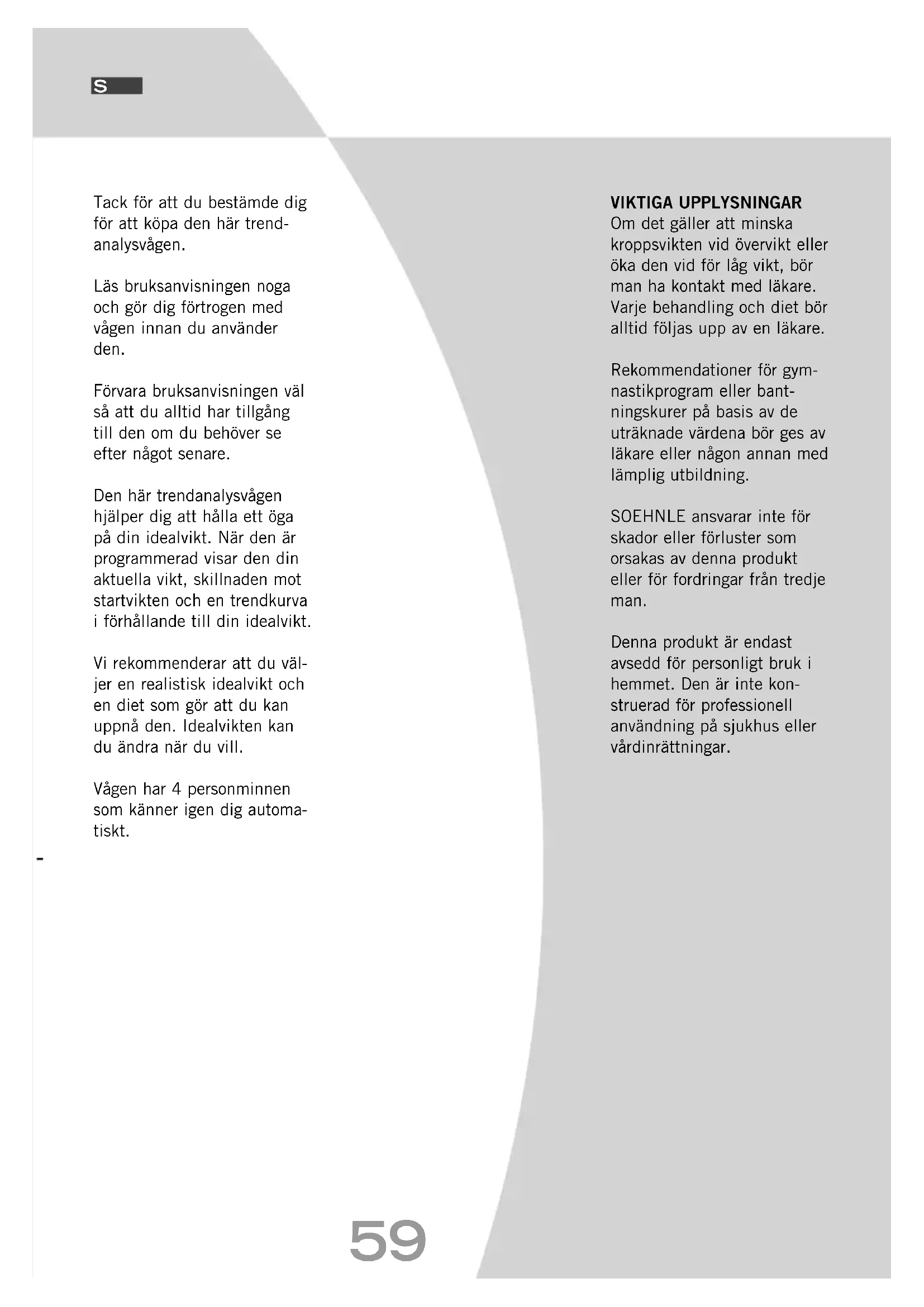 BA63150tendence117634_V8.qxd 07.02.2007 7:08 Uhr Seite 5859 Tack för att du bestämde dig för att köpa den här trend- analysvågen. Läs bruksanvisningen noga och gör dig förtrogen med vågen innan du använder den. Förvara bruksanvisningen väl så att du alltid har tillgång till den om du behöver se efter något senare. Den här trendanalysvågen hjälper dig att hålla ett öga på din idealvikt. När den är programmerad visar den din aktuella vikt, skillnaden mot startvikten och en trendkurva i förhållande till din idealvikt. Vi rekommenderar att du väl- jer en realistisk idealvikt och en diet som gör att du kan uppnå den. Idealvikten kan du ändra när du vill. Vågen har 4 personminnen som känner igen dig automa- tiskt. VIKTIGA UPPLYSNINGAR Om det gäller att minska kroppsvikten vid övervikt eller öka den vid för låg vikt, bör man ha kontakt med läkare. Varje behandling och diet bör alltid följas upp av en läkare. Rekommendationer för gym- nastikprogram eller bant- ningskurer på basis av de uträknade värdena bör ges av läkare eller någon annan med lämplig utbildning. SOEHNLE ansvarar inte för skador eller förluster som orsakas av denna produkt eller för fordringar från tredje man. Denna produkt är endast avsedd för personligt bruk i hemmet. Den är inte kon- struerad för professionell användning på sjukhus eller vårdinrättningar.