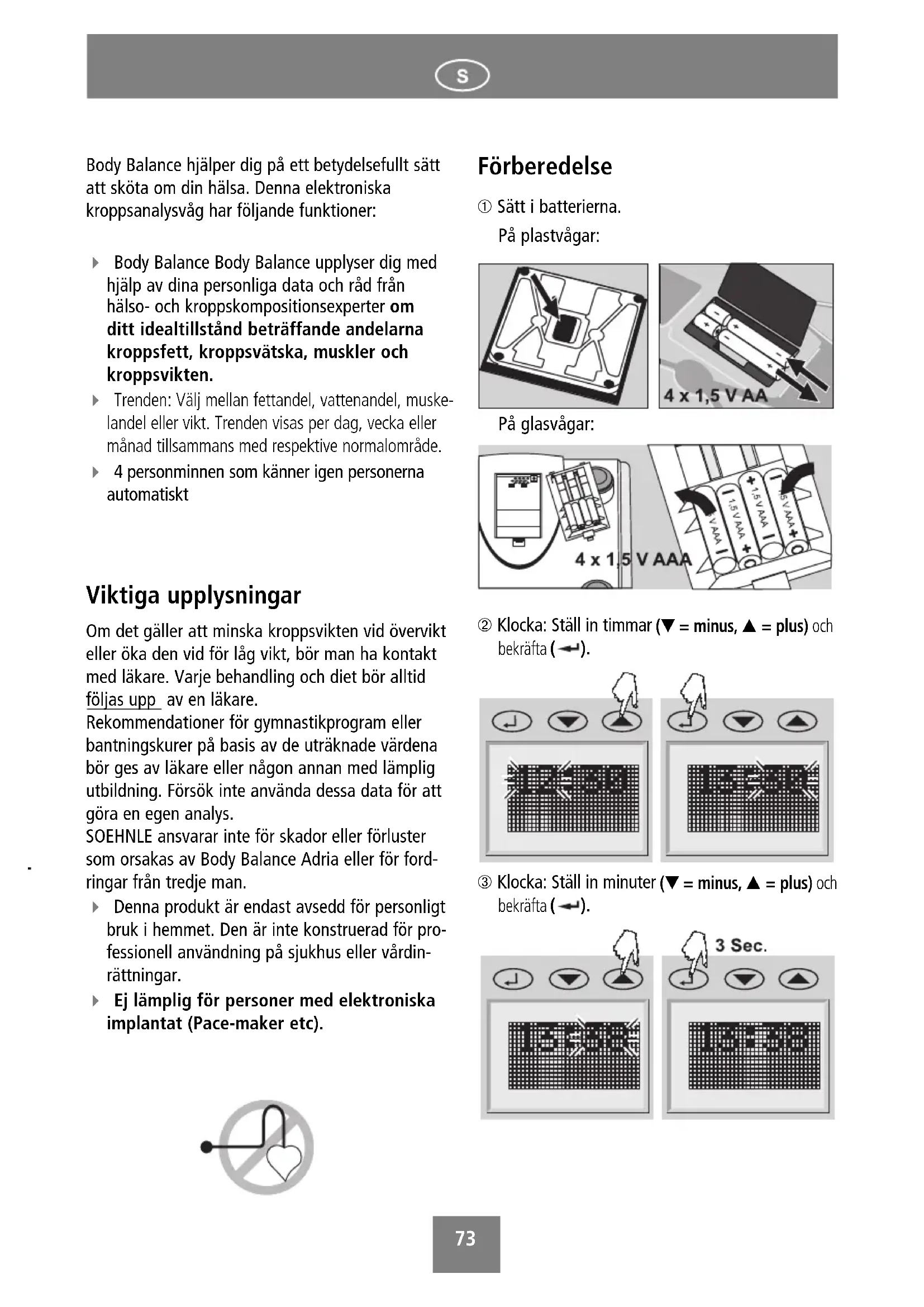 BA_63711_neu_V8.qxd 19.01.2006 12:02 Uhr Seite 7273 Body Balance hjälper dig på ett betydelsefullt sätt att sköta om din hälsa. Denna elektroniska kroppsanalysvåg har följande funktioner: Body Balance Body Balance upplyser dig med hjälp av dina personliga data och råd från hälso- och kroppskompositionsexperter om ditt idealtillstånd beträffande andelarna kroppsfett, kroppsvätska, muskler och kroppsvikten. Trenden: Välj mellan fettandel, vattenandel, muske- landel eller vikt. Trenden visas per dag, vecka eller månad tillsammans med respektive normalområde. 4 personminnen som känner igen personerna automatiskt Viktiga upplysningar Om det gäller att minska kroppsvikten vid övervikt eller öka den vid för låg vikt, bör man ha kontakt med läkare. Varje behandling och diet bör alltid följas upp av en läkare. Rekommendationer för gymnastikprogram eller bantningskurer på basis av de uträknade värdena bör ges av läkare eller någon annan med lämplig utbildning. Försök inte använda dessa data för att göra en egen analys. SOEHNLE ansvarar inte för skador eller förluster som orsakas av Body Balance Adria eller för ford- ringar från tredje man. Denna produkt är endast avsedd för personligt bruk i hemmet. Den är inte konstruerad för pro- fessionell användning på sjukhus eller vårdin- rättningar. Ej lämplig för personer med elektroniska implantat (Pace-maker etc). Förberedelse ➀ Sätt i batterierna. På plastvågar: På glasvågar: ➁ Klocka: Ställ in timmar (▼ = minus, ▲ = plus) och bekräfta
