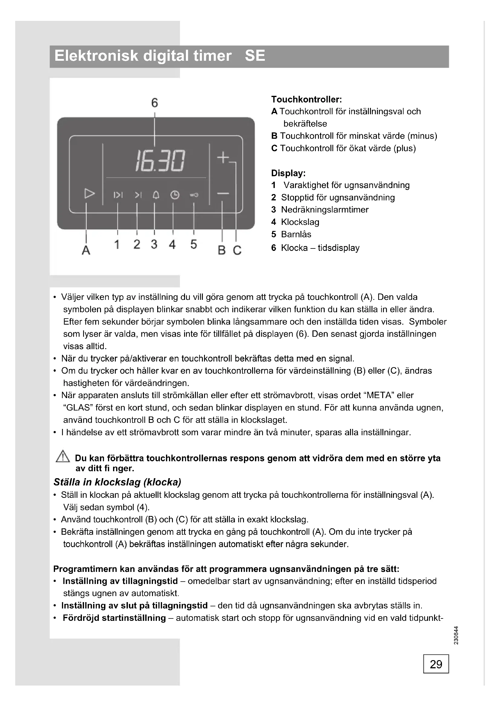 Touchkontroller: A Touchkontroll för inställningsval och bekräftelse B Touchkontroll för minskat värde (minus) C Touchkontroll för ökat värde (plus) Display: 1 Varaktighet för ugnsanvändning 2 Stopptid för ugnsanvändning 3 Nedräkningslarmtimer 4 Klockslag 5 Barnlås 6 Klocka – tidsdisplay