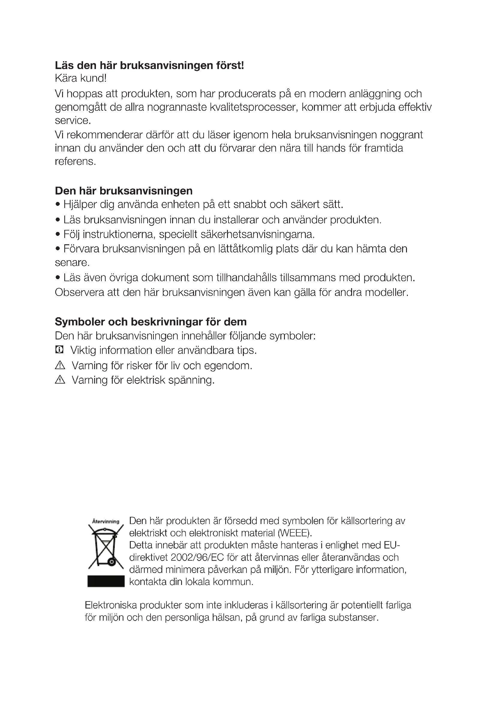 - Läs även övriga dokument som tillhandahålls tillsammans med produkten. Observera att den här bruksanvisningen även kan gälla för andra modeller. Symboler och beskrivningar för dem Den här bruksanvisningen innehåller följande symboler: C Viktig information eller användbara tips. A Varning för risker för liv och egendom. B Varning för elektrisk spänning. Den här produkten är försedd med symbolen för källsortering av elektriskt och elektroniskt material (WEEE). Detta innebär att produkten måste hanteras i enlighet med EU- direktivet 2002/96/EC för att återvinnas eller återanvändas och därmed minimera påverkan på miljön. För ytterligare information, kontakta din lokala kommun. Elektroniska produkter som inte inkluderas i källsortering är potentiellt farliga för miljön och den personliga hälsan, på grund av farliga substanser.SV