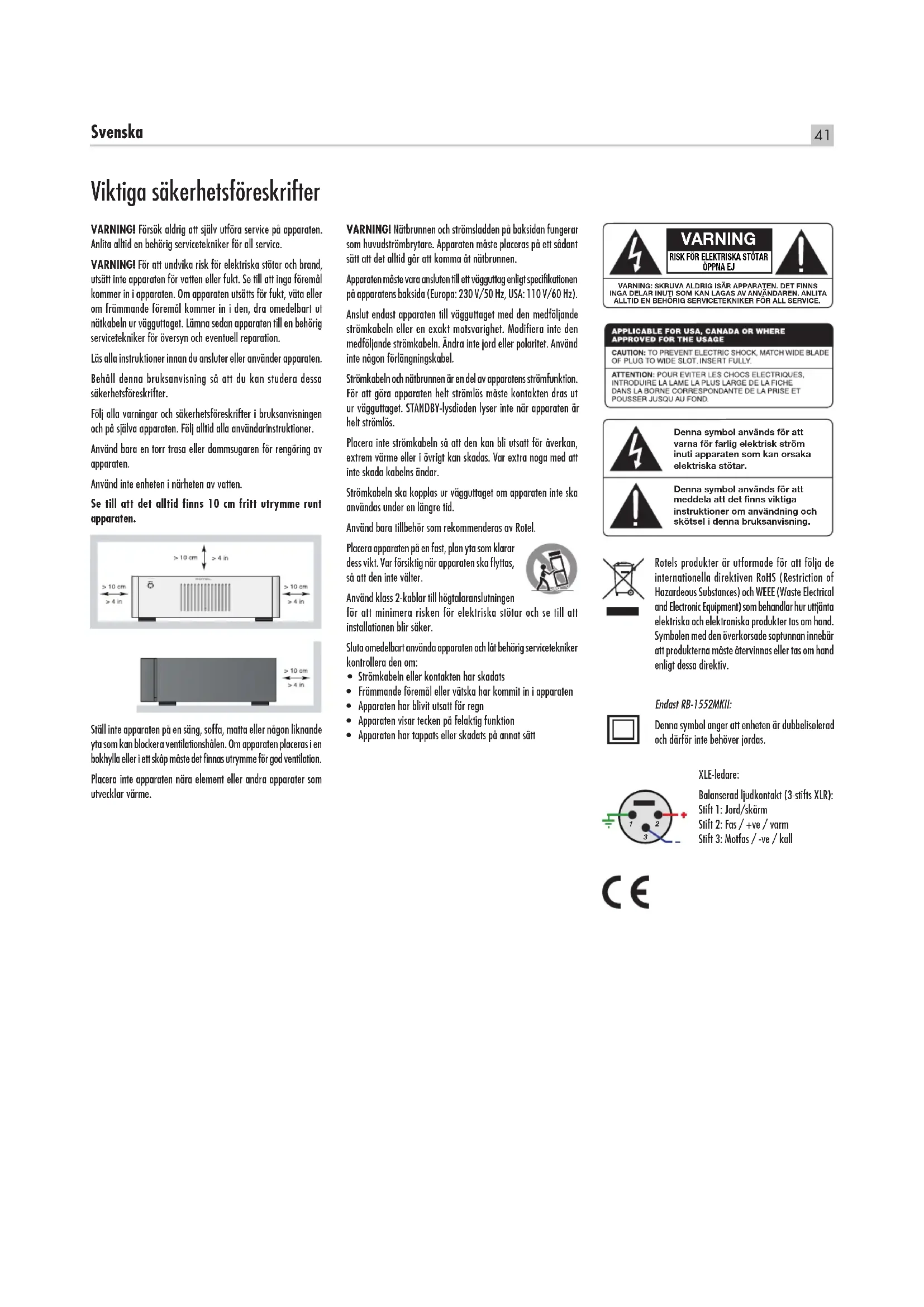- XLE-ledare: Balanserad ljudkontakt (3-stifts XLR): Stift 1: Jord/skärm Stift 2: Fas / +ve / varm Stift 3: Motfas / -ve / kall VARNING RISK FÖR ELEKTRISKA STÖTAR ÖPPNA EJVARNING: SKRUVA ALDRIG ISÄR APPARATEN. DET FINNS INGA DELAR INUTI SOM KAN LAGAS AV ANVÄNDAREN. ANLITA ALLTID EN BEHÖRIG SERVICETEKNIKER FÖR ALL SERVICE.Denna symbol används för att varna för farlig elektrisk ström inuti apparaten som kan orsaka elektriska stötar.Denna symbol används för att meddela att det finns viktiga instruktioner om användning och skötsel i denna bruksanvisning.42 RB-1552MKII/RB-1582MKII stereoslutsteg Om Rotel Vår historia började för mer än 50 år sedan. Under alla år sedan dess har våra produkter belönats med hundratals utmärkelser och roat hundratusentals människor som tar sin underhållning på allvar – precis som du! Rotel grundades av en familj med ett passionerat intresse för musik. Detta ledde till en egen tillverkning av hifi-produkter med en kompromisslös kvalitet. Genom alla år har denna passion för musik, som delas av hela Rotels personal, varit oförminskad och målet har alltid varit att tillverka prisvärda produkter för både audiofiler och musikälskare, vilken budget de än har. Rotels ingenjörer arbetar i team och har ett nära samarbete. Tillsammans lyssnar de på och finslipar varje ny produkt tills den lever upp till deras höga krav. De får välja komponenter från hela världen för att göra produkterna så bra som möjligt. I apparaterna hittar du ofta allt från brittiska och tyska kondensatorer till japanska och amerikanska halvledare samt toroidaltransformatorer som tillverkas i Rotels egna fabriker. Vi bryr oss om miljön. Eftersom allt mer elektronik tillverkas, och så småningom kasseras, är det särskilt viktigt att tillverkare gör vad de kan för att produkterna får så liten inverkan som möjligt på sophantering och vattenmiljö. På Rotel är vi stolta över att kunna bidra. Vi har reducerat blyinnehållet i vår elektronik genom att använda ett speciellt ROHS-lödtenn, och våra Class D-förstärkare (ej digitala) är upp till fem gånger mer effektiva än våra äldre modeller samtidigt som de är kraftfulla och har höga prestanda. Dessa produkter utvecklar lite värme, slösar minimalt med energi, är bra för miljön – och låter bättre. Slutligen är denna manual tryckt på återvunnet papper. Även om detta är små, första steg så är de viktiga. Och vi fortsätter att eftersträva nya metoder och material som kan ge en renare och grönare tillverkning. Alla vi på Rotel är glada för att du köpt denna produkt. Vi är övertygade om att den kommer att ge dig många års njutning och glädje. Ett par ord om watt RB-1552MKII specificeras till 130 watt per kanal och RB-1582MKII specificeras till 200 watt per kanal, när båda kanalerna drivs samtidigt med full kraft. Rotel har valt att specificera effekten på detta sätt eftersom vi anser att det ger den mest korrekta bilden av en förstärkares kapacitet. När du jämför specifikationer med andra produkter bör du tänka på att effekt ofta specificeras på andra sätt, vilket innebär att du kanske jämför äpplen och päron. Effekten kan till exempel anges när bara en enda kanal drivs, vilket ger ett högre värde. Den effektiva strömförsörjningen i Rotels förstärkare garanterar att de lämnar hela den specificerade effekten i en eller båda kanaler. En högtalares impedans anger det elektriska motstånd som den har när den ansluts till en förstärkare, oftast 8 eller 4 ohm. Ju lägre impedansen är desto mer kraft behöver högtalaren. En högtalare med 4 ohms impedans behöver i själva verket dubbelt så mycket kraft som en med 8 ohm. Rotels förstärkare är dock konstruerade så att de fungerar med vilken impedans som helst mellan 8 och 4 ohm, och med alla kanaler drivna på full effekt. Eftersom Rotels konstruktion är optimerad för att alla kanaler ska drivas samtidigt kan Rotel ange den sanna effekten för alla kanaler. Detta kan även vara viktigt för din underhållning. När du tittar på film är det bra om förstärkaren kan lämna full effekt i alla kanaler samtidigt, särskilt när en vulkan exploderar! Introduktion Tack för att du har köpt Rotel RB-1552MKII eller RB-1582MKII. I en kvalitetsanläggning för musik eller hemmabio kommer det att ge dig många års musikalisk njutning. RB-1552MKII och RB-1582MKII är sofistikerade slutsteg med två kanaler och mycket hög ljudkvalitet. Diskreta utgångssteg, massiv strömförsörjning, förstklassiga komponenter och Rotels Balanced Design garanterar en mycket hög ljudkvalitet. Den kraftiga strömförsörjningen gör att RB-1552MKII och RB-1582MKII kan driva krävande högtalare utan problem. Innehåll Figur 1: Kontroller och anslutningar 3 Figur 2: Analoga ingångar och högtalaranslutningar 4 Figur 3: Balanserade ingångar (XLR) 5 Viktigt 6 Viktiga säkerhetsföreskrifter p. 41