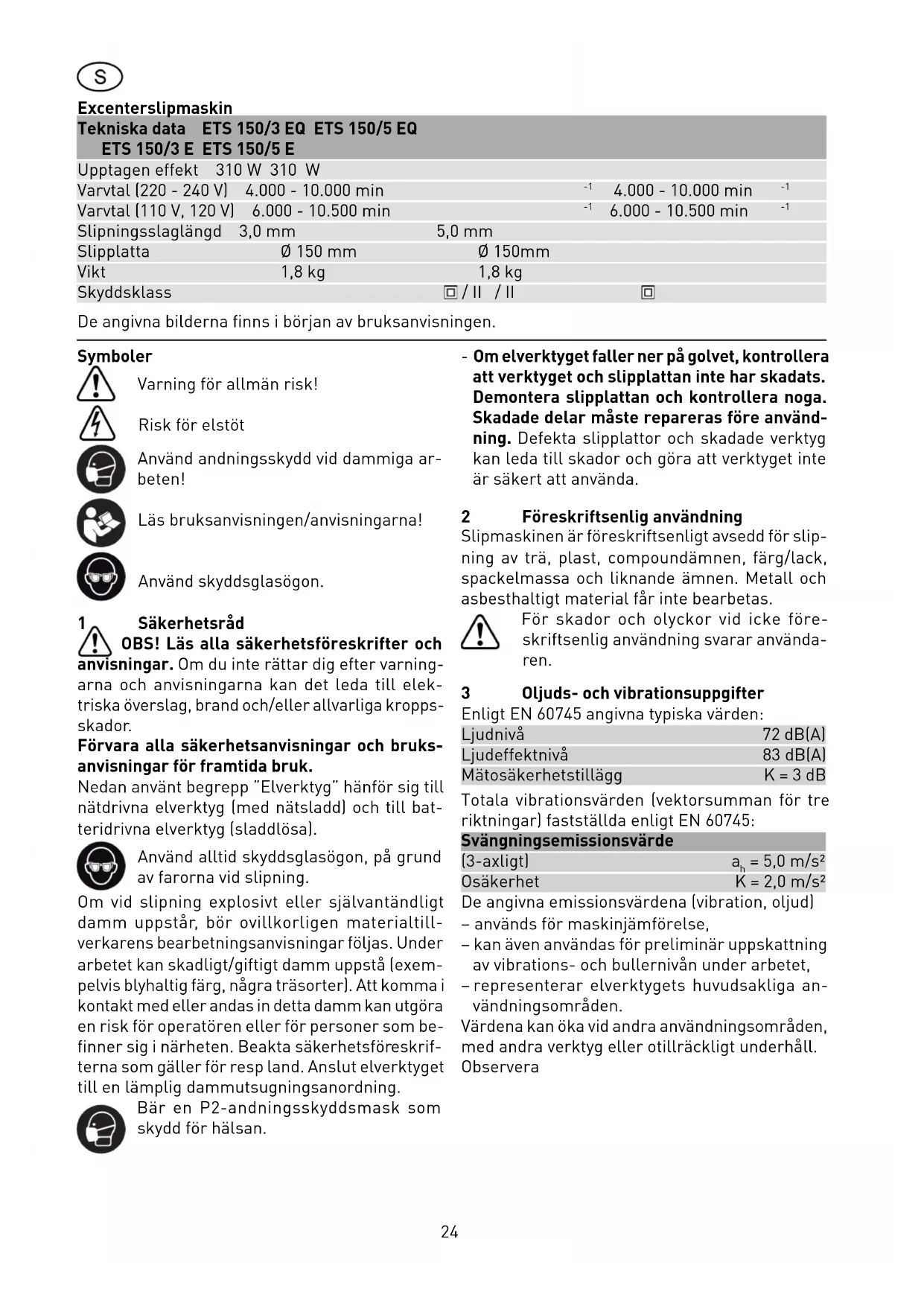 Slipningsslaglängd 3,0 mm 5,0 mm Slipplatta Ø 150 mm Ø 150mm Vikt 1,8 kg 1,8 kg Skyddsklass / II / II De angivna bilderna fi nns i början av bruksanvisningen. Symboler Varning för allmän risk! Risk för elstöt Använd andningsskydd vid dammiga ar- beten! Läs bruksanvisningen/anvisningarna! Använd skyddsglasögon. 1 Säkerhetsråd OBS! Läs alla säkerhetsföreskrifter och anvisningar. Om du inte rättar dig efter varning- arna och anvisningarna kan det leda till elek- triska överslag, brand och/eller allvarliga kropps- skador. Förvara alla säkerhetsanvisningar och bruks- anvisningar för framtida bruk. Nedan använt begrepp ”Elverktyg” hänför sig till nätdrivna elverktyg (med nätsladd) och till bat- teridrivna elverktyg (sladdlösa). Använd alltid skyddsglasögon, på grund av farorna vid slipning. Om vid slipning explosivt eller självantändligt damm uppstår, bör ovillkorligen materialtill- verkarens bearbetningsanvisningar följas. Under arbetet kan skadligt/giftigt damm uppstå (exem- pelvis blyhaltig färg, några träsorter). Att komma i kontakt med eller andas in detta damm kan utgöra en risk för operatören eller för personer som be- fi nner sig i närheten. Beakta säkerhetsföreskrif- terna som gäller för resp land. Anslut elverktyget till en lämplig dammutsugningsanordning. Bär en P2-andningsskyddsmask som skydd för hälsan. - Om elverktyget faller ner på golvet, kontrollera att verktyget och slipplattan inte har skadats. Demontera slipplattan och kontrollera noga. Skadade delar måste repareras före använd- ning. Defekta slipplattor och skadade verktyg kan leda till skador och göra att verktyget inte är säkert att använda. 2 Föreskriftsenlig användning Slipmaskinen är föreskriftsenligt avsedd för slip- ning av trä, plast, compoundämnen, färg/lack, spackelmassa och liknande ämnen. Metall och asbesthaltigt material får inte bearbetas. För skador och olyckor vid icke före- skriftsenlig användning svarar använda- ren. 3 Oljuds- och vibrationsuppgifter Enligt EN 60745 angivna typiska värden: Ljudnivå 72 dB(A) Ljudeffektnivå 83 dB(A) Mätosäkerhetstillägg K = 3 dB Totala vibrationsvärden (vektorsumman för tre riktningar) fastställda enligt EN 60745: Svängningsemissionsvärde (3-axligt) a