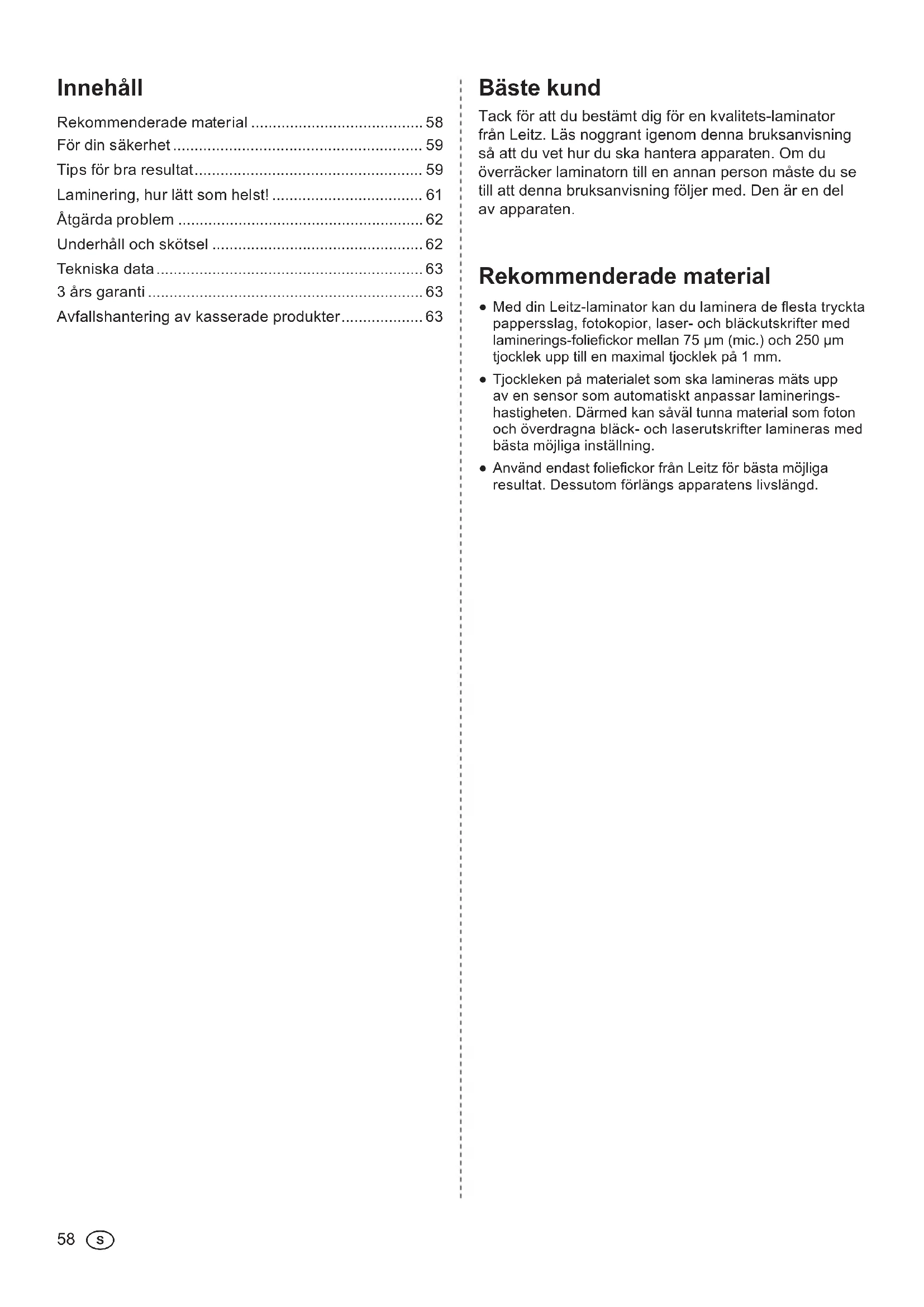 S S Bäste kund Tack för att du bestämt dig för en kvalitets-laminator från Leitz. Läs noggrant igenom denna bruksanvisning så att du vet hur du ska hantera apparaten. Om du överräcker laminatorn till en annan person måste du se till att denna bruksanvisning följer med. Den är en del av apparaten. Rekommenderade material