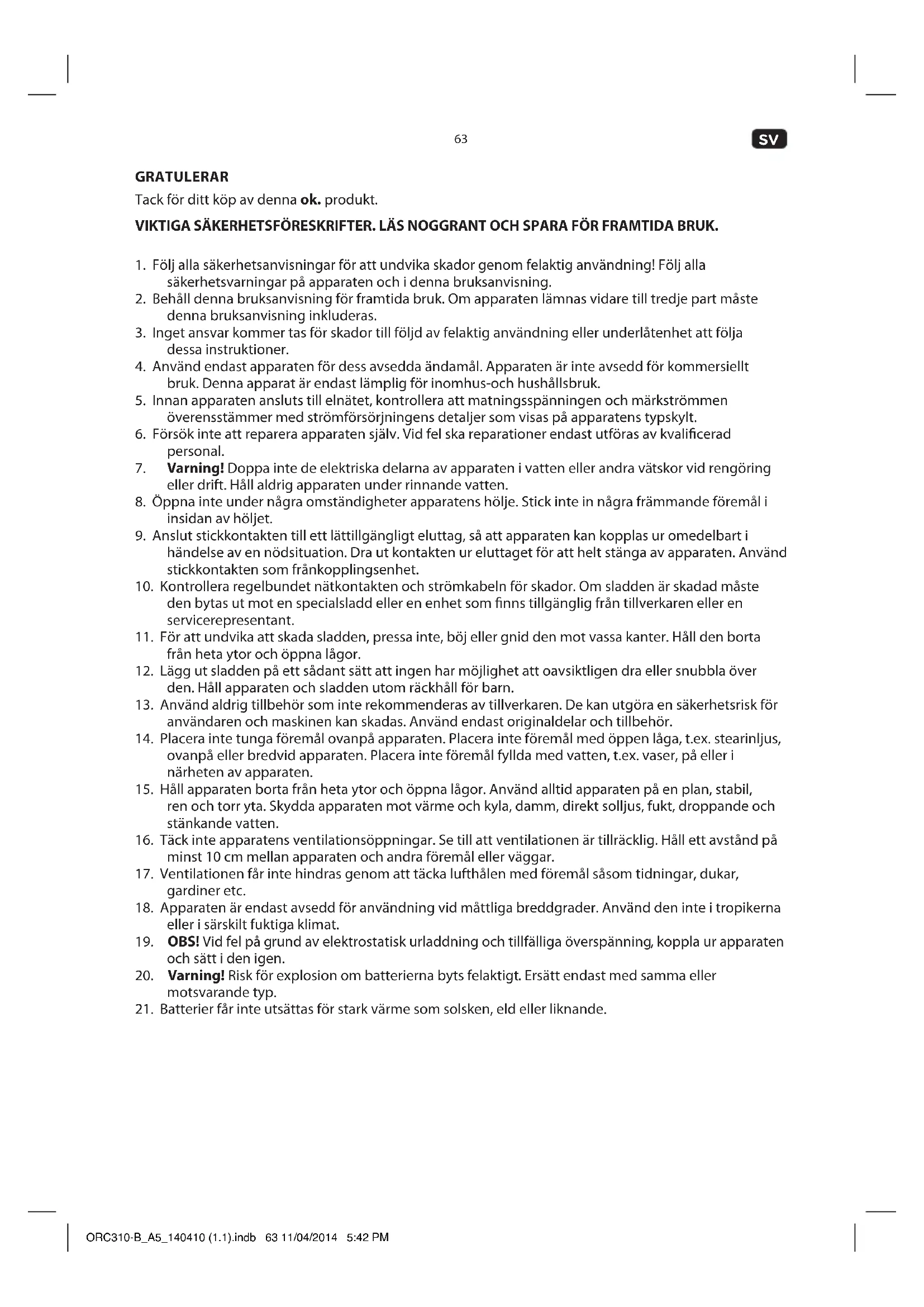 KASSERING Logotypen med den överkorsade soptunnan kräver separat insamling av avfall som innehåller elektriska eller elektroniska produkter (WEEE). Elektrisk och elektronisk utrustning kan innehålla farliga och skadliga ämnen. Släng inte denna apparat som osorterat avfall. Lämna in den till en uppsamlingsplats för återvinning av WEEE. På så sätt hjälper du till att bevara resurser och skydda miljön. Kontakta din återförsäljare eller lokala myndigheter för mer information. ORC310-B_A5_140410 (1.1).indb 68 11/04/2014 5:42 PM69