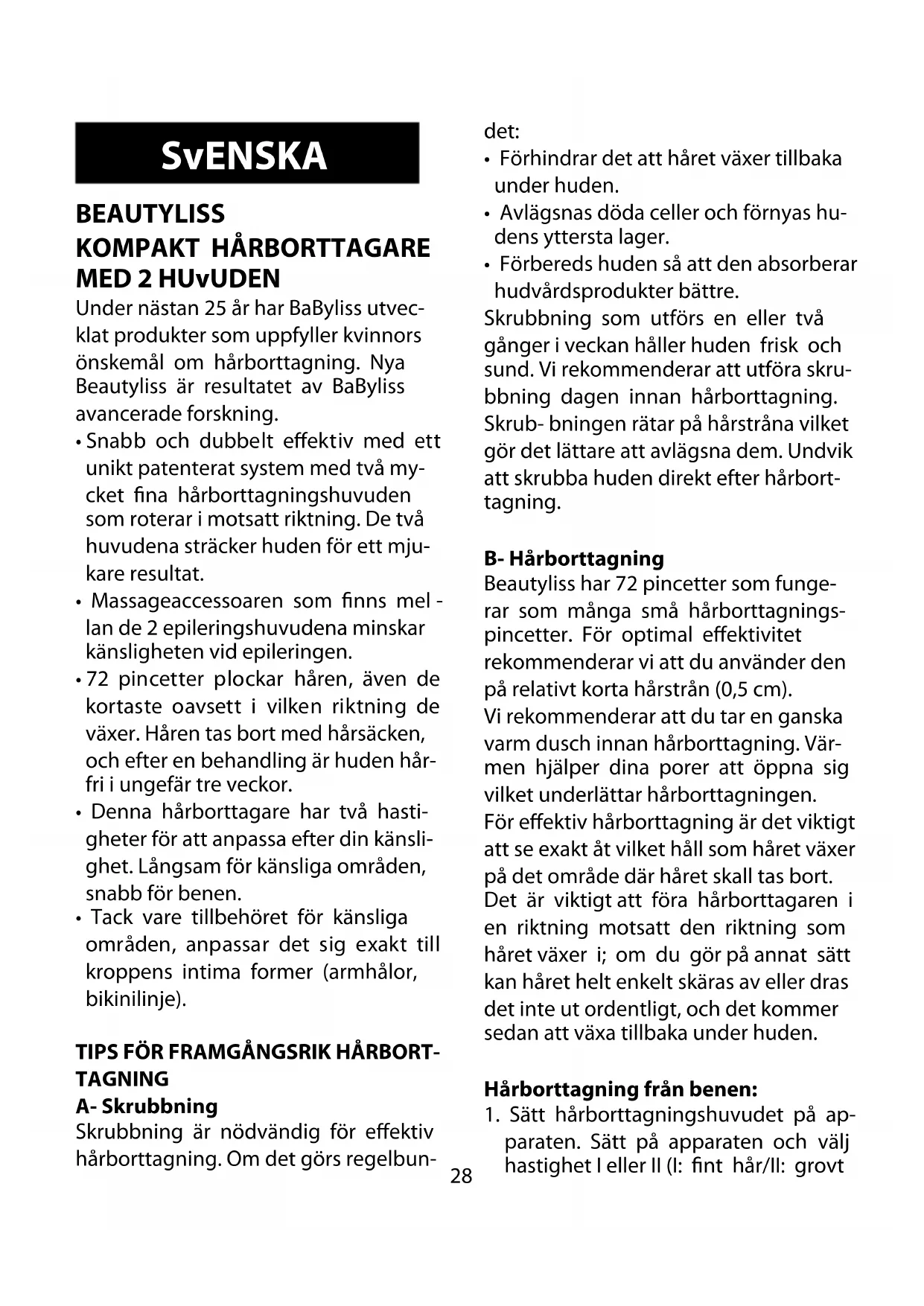 - BaByliss Beautyliss skall endast använ- das för hårborttagning och enligt an- visningarna i denna bruksanvisning.