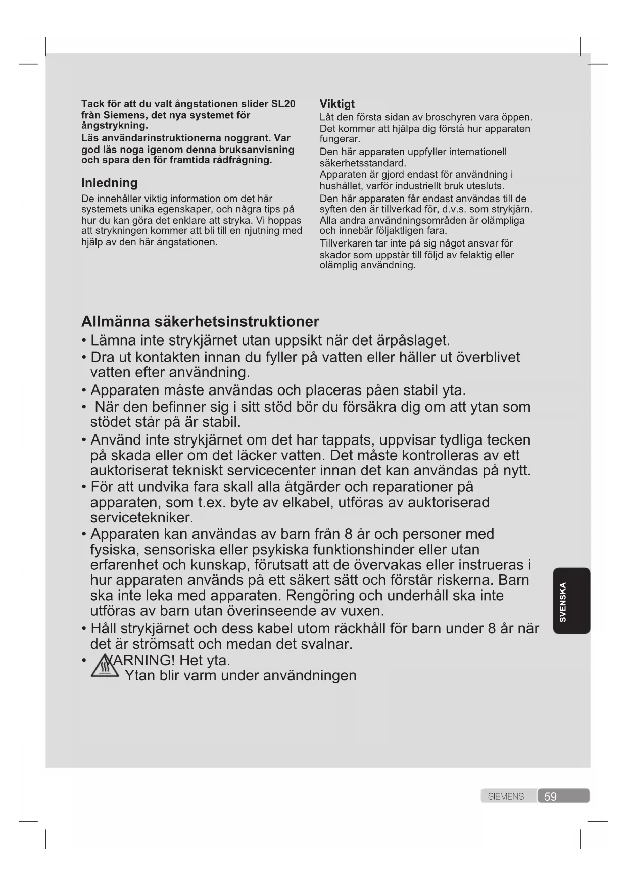 - Trykk på utløseren én gang til, og strykejernet slutter å slippe ut damp umiddelbart. Dersom ikke noe av dette som er nevnt ovenforskulle løse problemet, ta kontakt med et autorisertteknisk servicesenter. DukanlasteneddennebruksanvisningenfraSiemenssinelokalenettsider.59 S I E M E N SSVENSKA TackförattduvaltångstationensliderSL20 frånSiemens,detnyasystemetför ångstrykning. Läsanvändarinstruktionernanoggrant.Var godläsnogaigenomdennabruksanvisning ochsparadenförframtidarådfrågning. Inledning De innehåller viktig information om det här systemets unika egenskaper, och några tips på hur du kan göra det enklare att stryka. Vi hoppas att strykningen kommer att bli till en njutning med hjälp av den här ångstationen. Viktigt Låt den första sidan av broschyren vara öppen. Det kommer att hjälpa dig förstå hur apparaten fungerar. Den här apparaten uppfyller internationell säkerhetsstandard. Apparaten är gjord endast för användning i hushållet, varför industriellt bruk utesluts. Den här apparaten får endast användas till de syften den är tillverkad för, d.v.s. som strykjärn. Alla andra användningsområden är olämpliga och innebär följaktligen fara. Tillverkaren tar inte på sig något ansvar för skador som uppstår till följd av felaktig eller olämplig användning. Allmännasäkerhetsinstruktioner