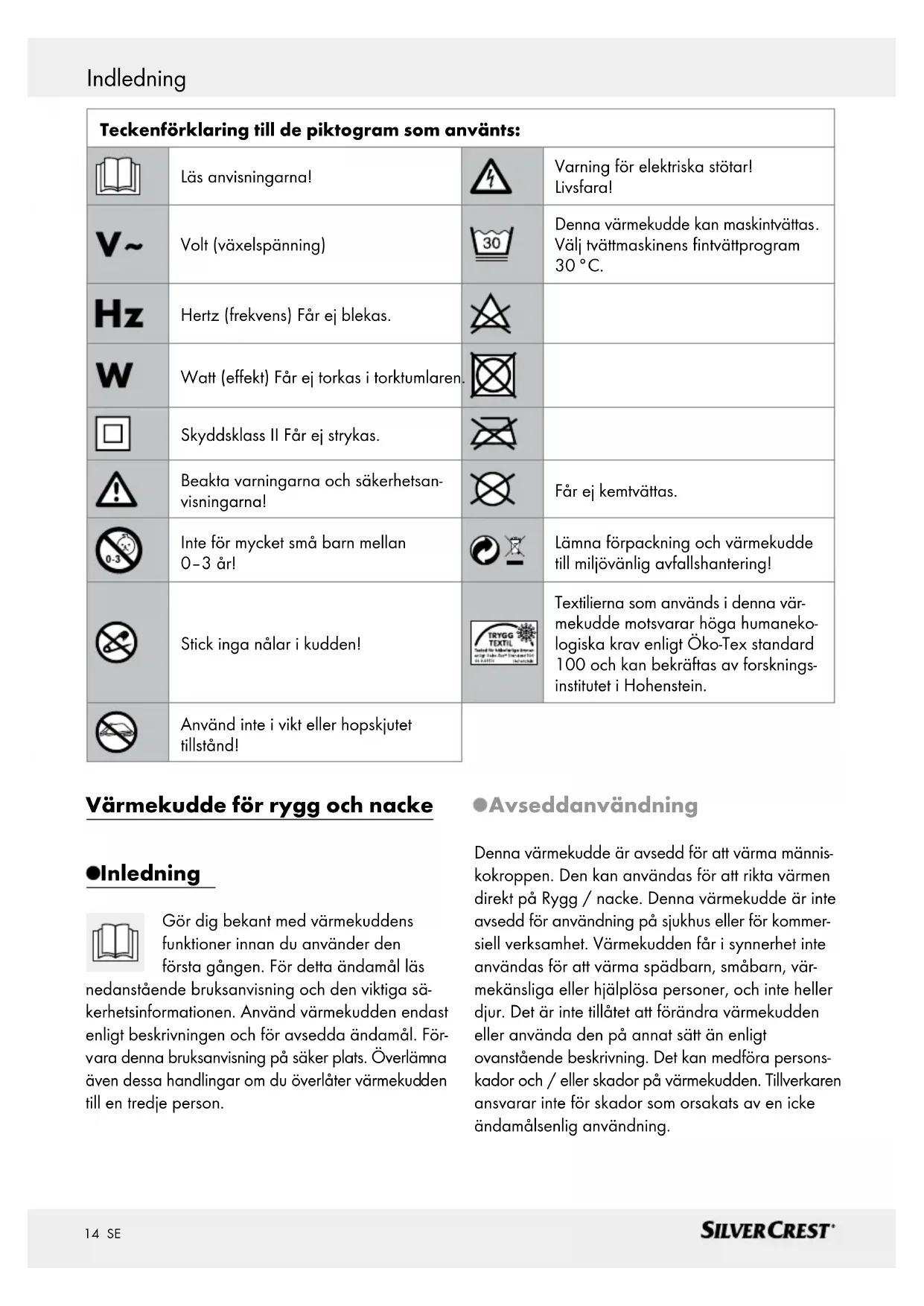 även dessa handlingar om du överlåter värmekud den till en tredje person. Avsedd användning Denna värmekudde är avsedd för att värma männis- kokroppen. Den kan användas för att rikta värmen direkt på Rygg / nacke. Denna värmekudde är inte avsedd för användning på sjukhus eller för kommer- siell verksamhet. Värmekudden får i synnerhet inte användas för att värma spädbarn, småbarn, vär- mekänsliga eller hjälplösa personer, och inte heller djur. Det är inte tillåtet att förändra värmekudden eller använda den på annat sätt än enligt ovanstående beskrivning. Det kan medföra persons- kador och / eller skador på värmekudden. Tillverkaren ansvarar inte för skador som orsakats av en icke ändamålsenlig användning. Teckenförklaring till de piktogram som använts: Läs anvisningarna! Varning för elektriska stötar! Livsfara! Volt (växelspänning) Denna värmekudde kan maskint vättas