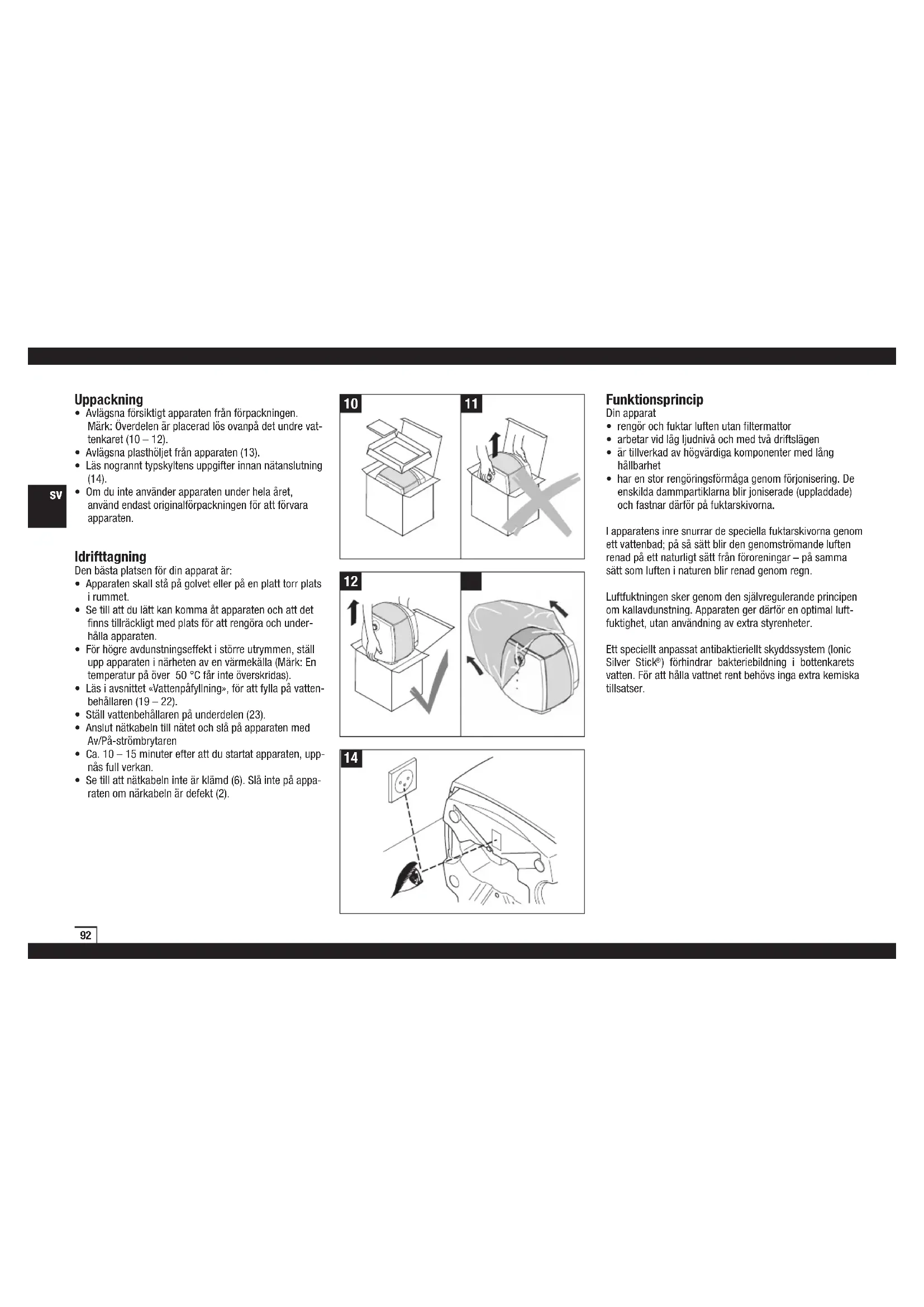 - Stickkontakten skall dras ur kontaktuttaget; varje gång vattenbehållaren skall fyllas eller tömmas, före varje rengöring, före varje gång enskilda delar skall monteras eller demonteras, och vid flyttning eller om- placering av apparaten.