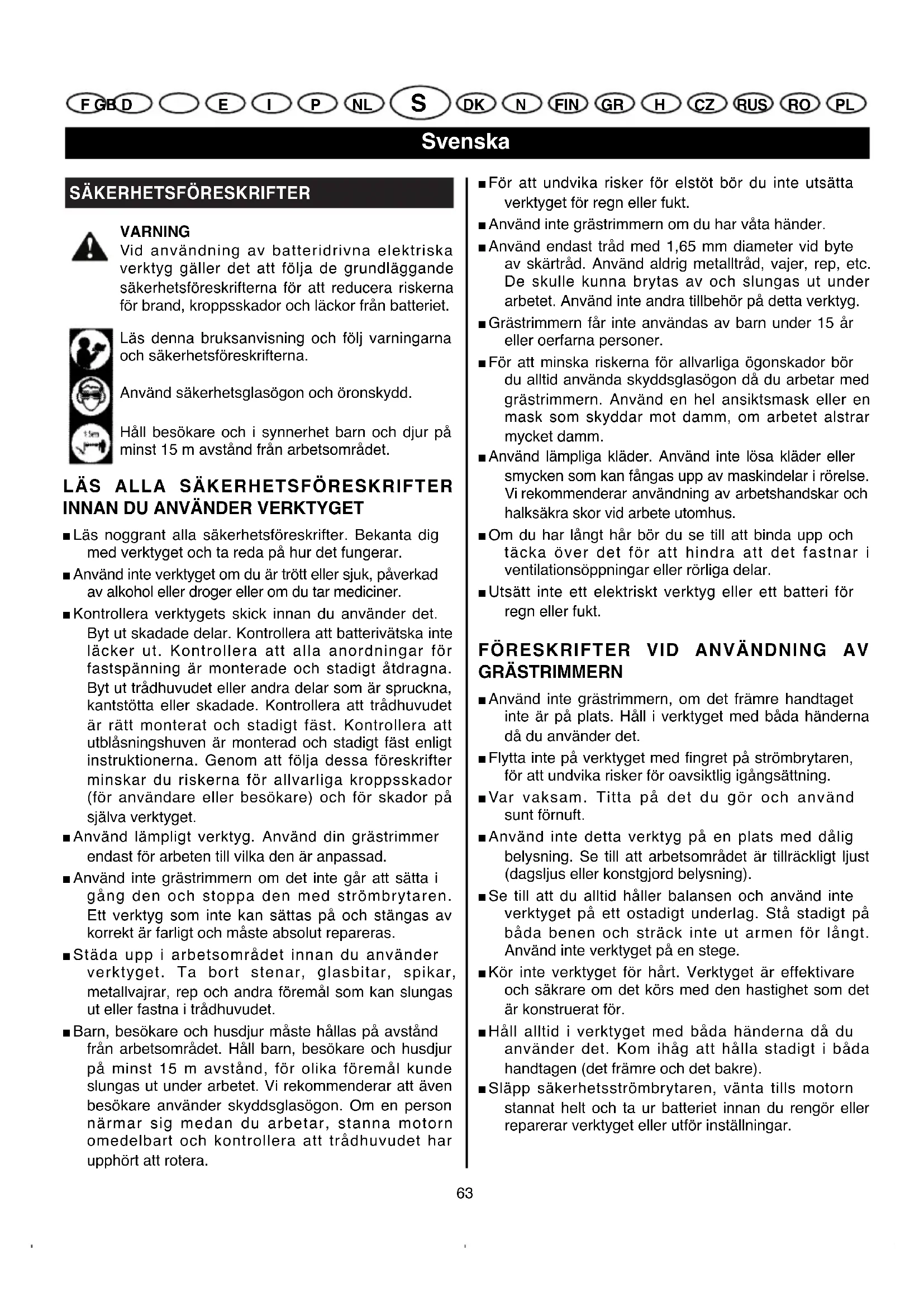 F GB D Nederlands E I P S DK N FIN GR H CZ RUS RO PL CLT-1423P / 1823 P manual 24/11/04 11:57 Page 62SÄKERHETSFÖRESKRIFTER VARNING Vid användning av batteridrivna elektriska verktyg gäller det att följa de grundläggande säkerhetsföreskrifterna för att reducera riskerna för brand, kroppsskador och läckor från batteriet. Läs denna bruksanvisning och följ varningarna och säkerhetsföreskrifterna. Använd säkerhetsglasögon och öronskydd. Håll besökare och i synnerhet barn och djur på minst 15 m avstånd från arbetsområdet.