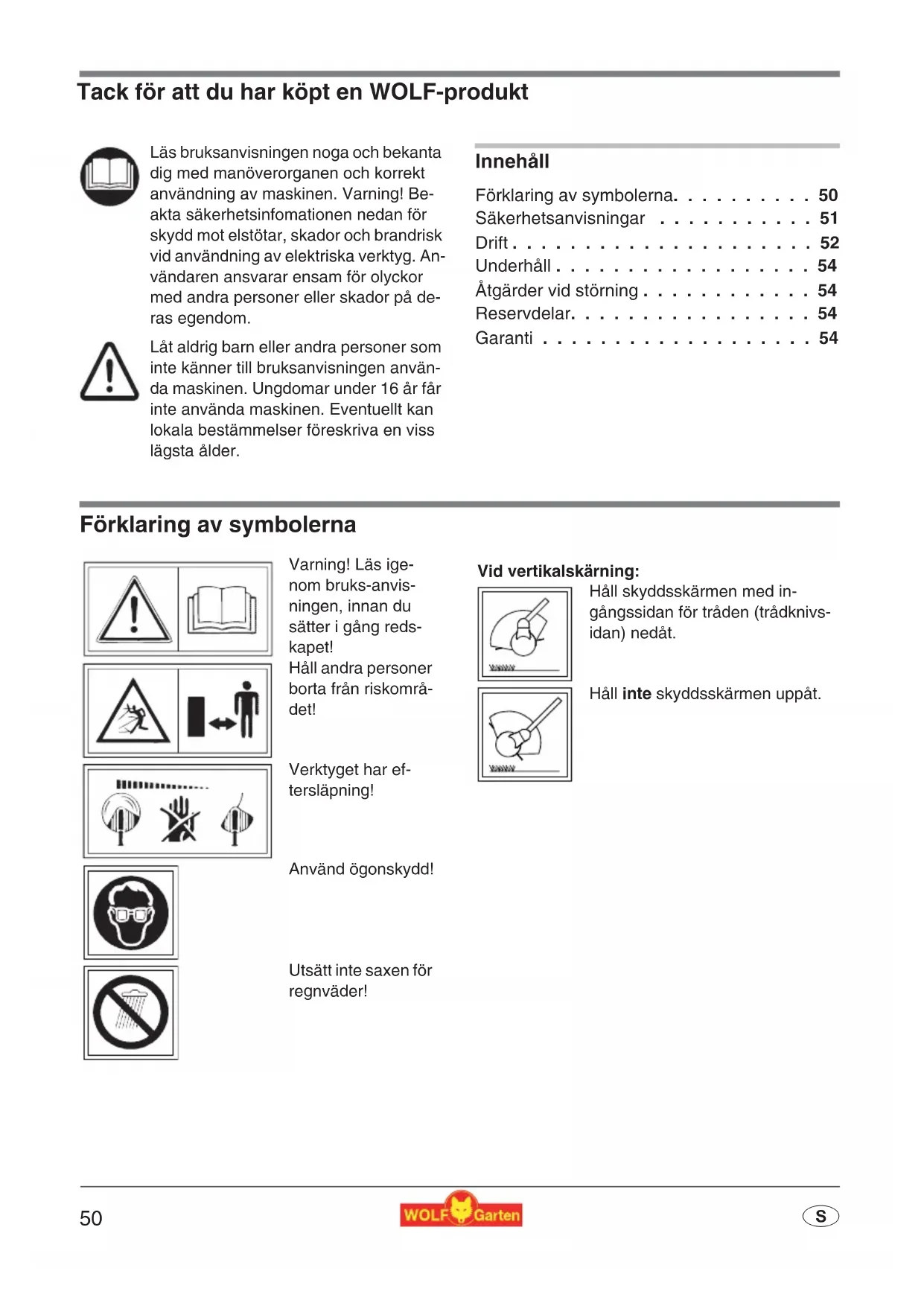 - Underhäll och rengöring av trimmern somt av-montering av tradskydd aller tradspole fär endast ske dā man dragit ur kontakten och dā motor och klippdelar stannat. Använd WOLFs original tradspole och läs anvisiningarna für byte!