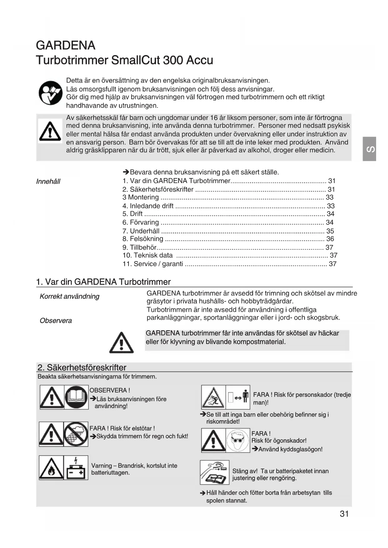 GARDENA Turbotrimmer SmallCut 300 Accu Detta är en översättning av den engelska originalbruksanvisningen. Läs omsorgsfullt igenom bruksanvisningen och följ dess anvisningar. Gör dig med hjälp av bruksanvisningen väl förtrogen med turbotrimmern och ett riktigt handhavande av utrustningen. Av säkerhetsskäl får barn och ungdomar under 16 år liksom personer, som inte är förtrogna med denna bruksanvisning, inte använda denna turbotrimmer. Personer med nedsatt psykisk eller mental hälsa får endast använda produkten under övervakning eller under instruktion av en ansvarig person. Barn bör övervakas för att se till att de inte leker med produkten. Använd aldrig gräsklipparen när du är trött, sjuk eller är påverkad av alkohol, droger eller medicin. Bevara denna bruksanvisning på ett säkert ställe.