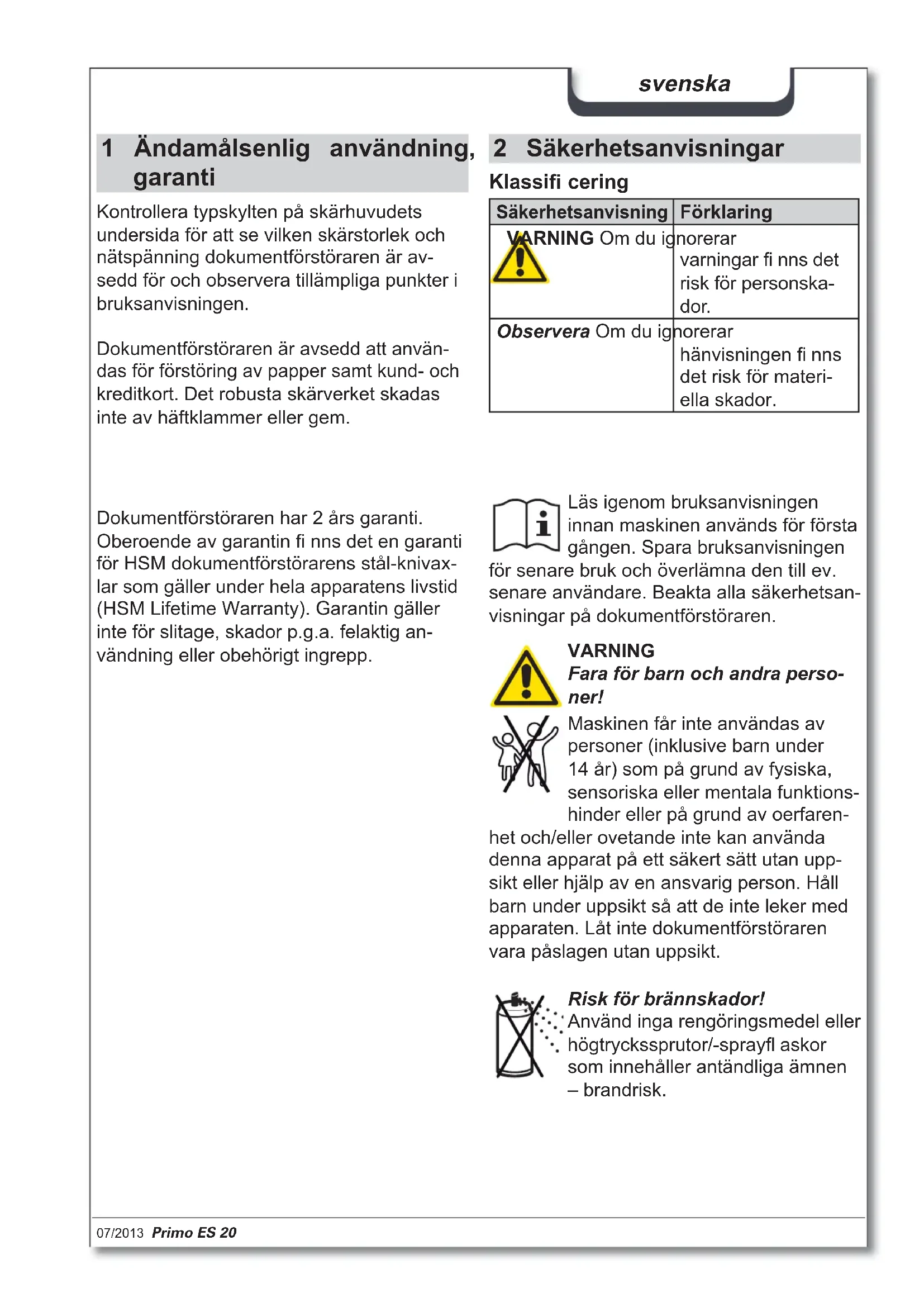 - EN 60950-1:2006 +A12:2011 Frickingen, 10.7.2013 ppa. Hubert Kötzinger - Leder produktudvikling miljøteknik07/2013 Primo ES 20 51 svenska 1 Ändamålsenlig användning, garanti 2 Säkerhetsanvisningar Klassifi cering Säkerhetsanvisning Förklaring VARNING Om du ignorerar varningar fi nns det risk för personska- dor. Observera Om du ignorerar hänvisningen fi nns det risk för materi- ella skador. Läs igenom bruksanvisningen innan maskinen används för första gången. Spara bruksanvisningen för senare bruk och överlämna den till ev. senare användare. Beakta alla säkerhetsan- visningar på dokumentförstöraren. VARNING Fara för barn och andra perso- ner! Maskinen får inte användas av personer (inklusive barn under 14 år) som på grund av fysiska, sensoriska eller mentala funktions- hinder eller på grund av oerfaren- het och/eller ovetande inte kan använda denna apparat på ett säkert sätt utan upp- sikt eller hjälp av en ansvarig person. Håll barn under uppsikt så att de inte leker med apparaten. Låt inte dokumentförstöraren vara påslagen utan uppsikt. Dokumentförstöraren har 2 års garanti. Oberoende av garantin fi nns det en garanti för HSM dokumentförstörarens stål-knivax- lar som gäller under hela apparatens livstid (HSM Lifetime Warranty). Garantin gäller inte för slitage, skador p.g.a. felaktig an- vändning eller obehörigt ingrepp. Kontrollera typskylten på skärhuvudets undersida för att se vilken skärstorlek och nätspänning dokumentförstöraren är av- sedd för och observera tillämpliga punkter i bruksanvisningen. Risk för brännskador! Använd inga rengöringsmedel eller högtryckssprutor/-sprayfl askor som innehåller antändliga ämnen – brandrisk. Dokumentförstöraren är avsedd att använ- das för förstöring av papper samt kund- och kreditkort. Det robusta skärverket skadas inte av häftklammer eller gem.52 Primo ES 20 07/2013 svenska VARNING Farlig nätspänning! Felaktig användning av maskinen kan ge elektriska stötar. – Kontrollera att strömnätets spänningoch frekvens stämmer överens med uppgif- terna på typskylten innan nätkontakten ansluts. – Se till att nätkontakten är lätt åtkomlig. – Se till att det inte kommer in vatten i do- kumentförstöraren, stoppa inte ner nätka- beln eller nätkontakten i vatten. – Ta inte i nätkontakten med våta händer. – Dra aldrig ut kontakten ur uttaget i slad- den, fatta alltid tag i kontakten. – Använd endast apparaten inomhus i torra rum. Slå aldrig på den i fuktiga rum eller i regn. VARNING Risk för skador! Stick aldrig in handen i inmat- ningsöppningen för papper. Risk för skador – indragning! Var försiktigt med långt hår, vida klädesplagg, slipsar, halsdukar, hals- och armband etc. – risk för indragning i inmatningsöppningen. Mata inte in något material som kan bilda slingor, t.ex. band, snö- ren, mjuk plastfolie. Kontrollera apparaten och kabeln regelbundet så att de inte är ska- dade. Om dokumentförstöraren uppvisar skador eller inte fungerar riktigt resp. om den ska fl yttas eller ren- göras: stäng av den och dra ut nätkontak- ten. – Låt inte apparaten, nätkontakten och nät- kabeln komma nära öppen eld och heta ytor. Luftspringorna får inte täckas över, dokumentförstörarens avstånd till väggen eller till möbler måste vara minst 5 cm. – Apparaten får inte användas direkt intill bildskärmer eller kontorsarbetsplatser. Servicearbeten som innefattar att huskåpor avlägsnas får endast utföras av HSM:s kundservice och av servicetekniker från våra part- ners. Kundtjänstadresser se sidan 68. HSM tillhandahåller reservdelar upp till 10 år efter att denna modell har slutat tillver- kas. Observera Fara vid felaktig användning Använd endast apparaten till avsedd användning enligt uppgifterna i kapitlet ”Ändamålsenlig användning”.07/2013 Primo ES 20 53 svenska 3 Översikt 1 Pappersbehållare 2 Skärhuvud 3 Säkerhetsanvisningar, säkerhetsdel 4 Inmatningsöppning för papper och kund-/ kreditkort 5 Start/stopp automatik 6 Reverseringsknapp R: retur 7 Typskylt på skärhuvudets undersida 4 Leveransomfång